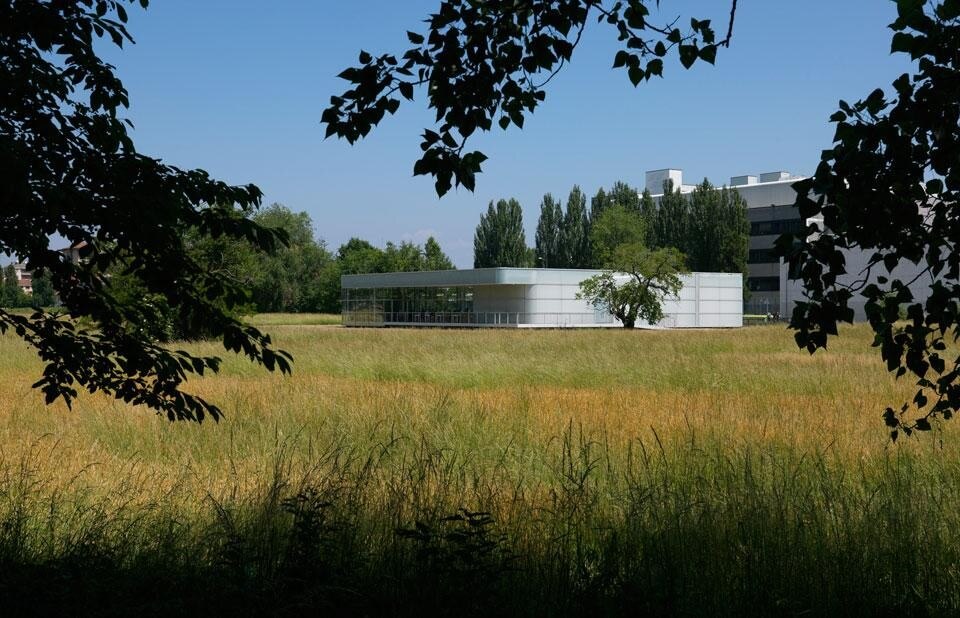 L'edificio, a pianta quadrata di 30 m di lato, raggiunge l'altezza di 6 m dal piano di campagna. L'involucro delle facciate nord, est e ovest è realizzato in vetrocamera extrachiaro montato su un sistema di sottili serramenti in acciaio in grado di rendere i fronti leggeri e trasparenti e garantire l'apertura di viste verso il parco.
