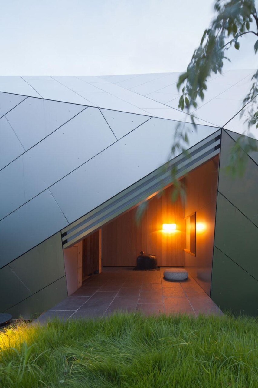La produzione recente dell'architetto giapponese è pervasa da opere con tetti strutturati a partire da poliedri, ma qui nella Hironaka House, tutto l'intervento – dai mobili alla struttura – deriva da speculazioni fatte sui poliedri. La Hironaka House si trova nei sobborghi di Tokyo, disposta su due piani, adagiata su un declivio di un sito di circa 300 metri quadri dalla forma triangolare. Al piano terra – pervaso da un'aria di serenità e silenzio – si trovano le stanze da letto e il soggiorno. Qui Yokogawa mette in dialogo interno ed esterno tramite una grande finestratura che corre lungo il perimetro dell'abitazione. Al piano superiore con il tetto dalla forma poliedrica si trovano uno studio e – occultata dietro un muro sul quale si trova una piccola apertura – si trova la stanza da tè. La piccola porta d'accesso alla stanza del tè – nijiriguchi – viene realizzata con dimensioni ristrette per ragioni simboliche e spaziali. Per entrare dentro la stanza del tè bisogna levarsi le scarpe e piegarsi, un gesto di umiltà prima di accedere in un stanza-mondo capace di allontanarci dalle preoccupazioni quotidiane. Una volta dentro si ha l'impressione che lo spazio sia di dimensioni maggiori rispetto alla sua grandezza effettiva: un effetto prodotto intenzionalmente dalla combinazione data dall'atto del piegarsi, dalle dimensioni ridotte della porta d'ingresso e della penombra della stanza del te. Qui Yokogawa elimina le relazione fra sé e mondo, coscienza e universo. La stanza del tè e la sua cerimonia sono un mezzo per eliminare l'ego e "spalmarsi" nell'infinito.