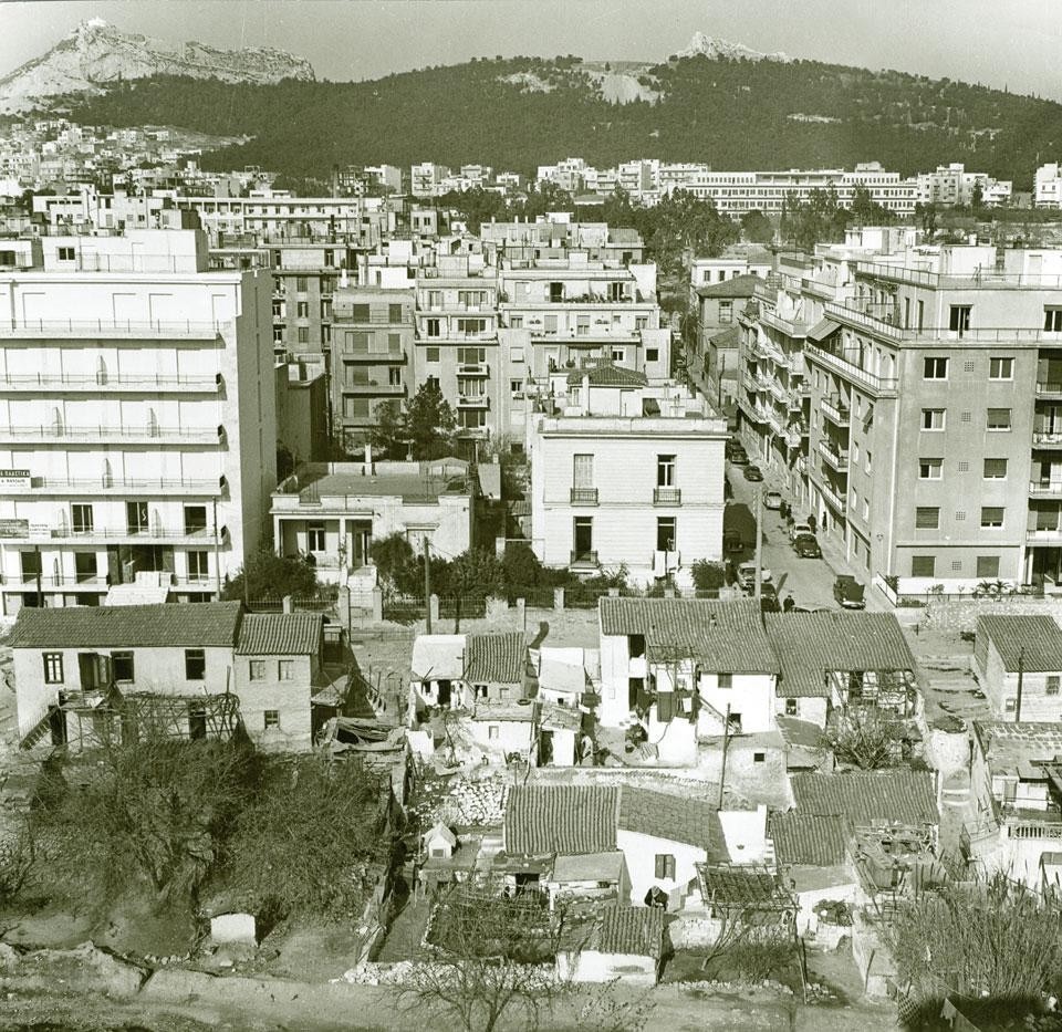 La polykatoikia fu concepita originariamente negli anni Trenta come edificio a più piani per appartamenti, destinato alla borghesia ateniese[3]. La proliferazione di questa tipologia fu sostenuta dallo Stato tramite la promulgazione di un regolamento edilizio generale e di una nuova legge sulla proprietà[4]. Questa legge consentiva ai proprietari di un terreno edificabile di scambiarlo, senza alcuna imposizione fiscale, con una certa quantità di spazio abitabile costruito—una decisione che toglieva allo Stato ogni possibilità di controllo sul settore edile che venne, in tal modo, deregolarizzato a tutti gli effetti. Il modello della polykatoikia mirava dunque a sviluppare e a rendere produttive le competenze tecniche del comparto edile locale, creando così un sistema coerente ma flessibile di tecniche costruttive, materiali, dettagli e schemi strutturali. Come nella Maison Dom-ino, questo sistema combinava soluzioni industriali avanzate con lo sfruttamento di manodopera non qualificata. Per mezzo della polykatoikia, il progetto della città veniva implementato non più attraverso una pianificazione generale decisa dall'alto, ma per mezzo di un quadro legislativo astratto, reso effettivo tramite la pratica della costruzione informale. Questa logica costruttiva diventò particolarmente importante e diffusa soprattutto con la ricostruzione postbellica di Atene. Al termine della Seconda guerra mondiale, la Grecia precipitò in una sanguinosa guerra civile, terminata con la sconfitta delle forze comuniste. Il nuovo governo 'democratico' mise a punto un piano per prevenire potenziali rivolte della classe operaia; parte di questa strategia si basava sulla decisione di evitare grandi concentrazioni industriali, incoraggiando piuttosto un'economia legata alla produzione edilizia su piccola scala, allo scopo di frammentare, e perciò controllare, la popolazione. Sostenendo il sistema della polykatoikia, il regime poté promuovere la ricostruzione del Paese e la conseguente ripresa economica con un intervento minimo da parte dello Stato[5]. In tal modo, il crescente bisogno di abitazioni era soddisfatto senza alcun programma di aiuti pubblici[6], mentre per una larga parte della popolazione si apriva la possibilità di diventare proprietari privati[7]. La forma generica della polykatoikia è stata capace di assorbire tutte le classi sociali e ha permesso qualsiasi tipo di arrangiamento spaziale, diventando così una tipologia adatta per ogni livello di densità urbana.