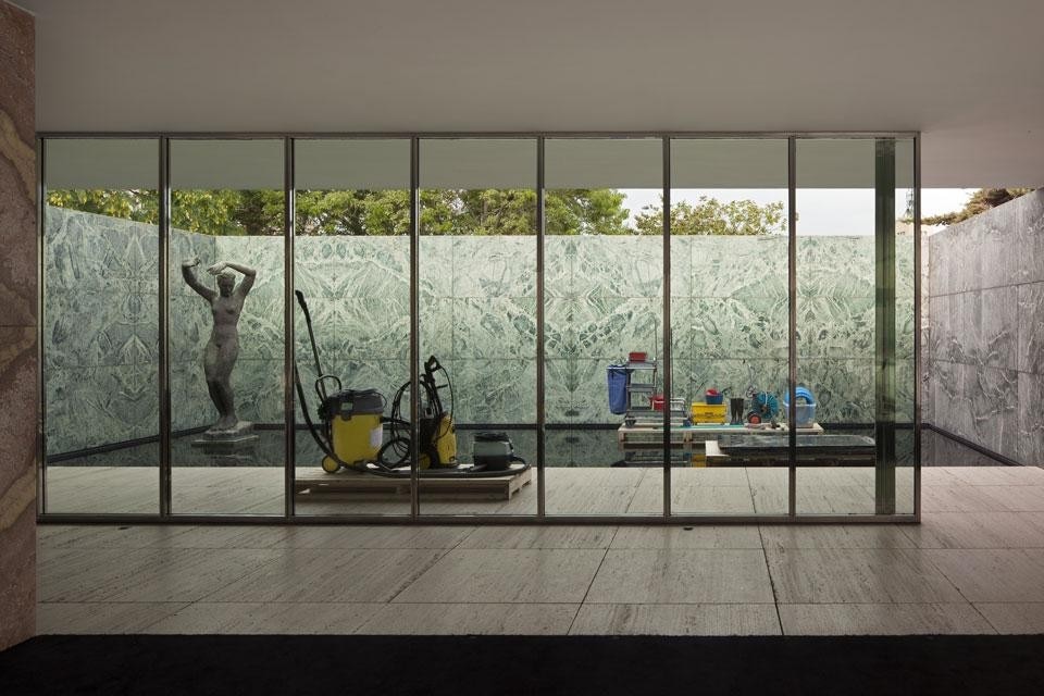 Se pensiamo al Padiglione di Mies van der Rohe ci vengono in mente molte immagini: un padiglione modesto, comparato alle grandi infrastrutture costruite per l'Esposizione Universale di Barcellona del 1929; un design semplice ma di grande forza architettonica, ricco di riflessi e trasparenze, pilastri metallici cruciformi; pensiamo a termini come "minimalismo", "pianta libera" o "continuità spaziale"; ma difficilmente ci chiederemo come viene pulito, dove si conservano i materiali per sostituire i pezzi o chi dà da mangiare ai gatti che si aggirano di lì giorno e notte. L'architetto Andrés Jaque e la sua Oficina de Innovación Politica hanno voluto dare visibilità a questi strati nascosti, quasi impercettibili, ma essenziali affinché un edificio del genere resti in attività. I lavori di ricostruzione del padiglione sono iniziati nel 1983, e il nuovo edificio è stato inaugurato nel 1986 nella sua sede originaria; gli architetti Ignasi de Solà-Morales, Cristian Cirici e Fernando Ramos sono stati scelti per la ricerca, il design e la direzione della ricostruzione del Padiglione.