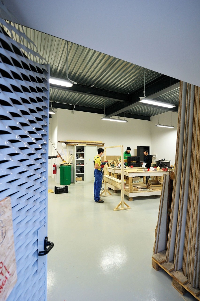 Scelte legate al contenimento dei costi hanno spinto alla semplificazione di alcune soluzioni, anche in corso d’opera: gli stessi pannelli di lamiera stirata che rivestono le facciate avrebbero dovuto ricoprire anche le finestre verticali, con la possibilità di essere regolati per filtrare l’afflusso di luce naturale e creare un oggetto architettonico dall’aspetto mutevole. Efficacemente, i progettisti hanno optato per dei frangisole fissi, sempre in lamiera stirata, raddoppiata per garantire la rigidità necessaria, bloccati a 90 gradi rispetto al piano verso sud. L’interno, intonacato di bianco, è oltremodo semplice; i soffitti del piano terra mostrano con onestà la lamiera corrugata e tutti i pavimenti sono in cemento elicotterato. La neutralità degli ambienti dovrebbe favorire il processo, già iniziato, della loro appropriazione e personalizzazione da parte delle associazioni.