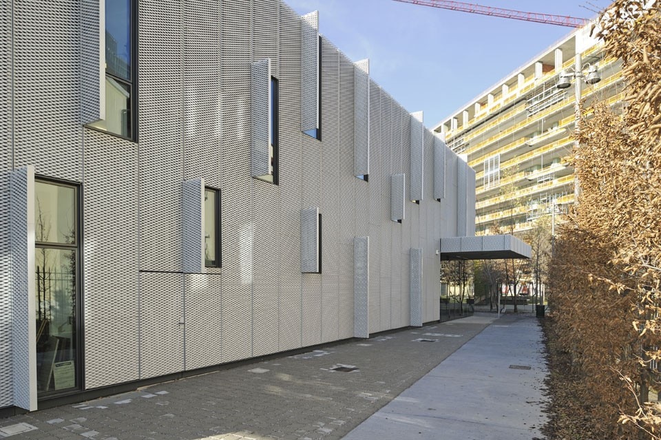 Il linguaggio perfettamente contemporaneo delle bucature dialoga a distanza con le grafie della mole non indifferente di torri che stanno crescendo poco più lontano, a nord, ovest e a sud dell’Incubatore. Bizzarramente, le finestre verticali sembrano mimare in maniera precisa i contrafforti che contribuiscono a sostenere la parete cieca di un edificio che gli volge le spalle e che affaccia sul suo stesso giardino, a ovest. Il disegno della copertura è estremamente curato, con la medesima lamiera dei lati lunghi che gira a rivestire il tetto; un unico taglio ospita i pannelli fotovoltaici e un pannello solare. L’Incubatore è un’architettura educata e civile, da qualsiasi angolo la si osservi.