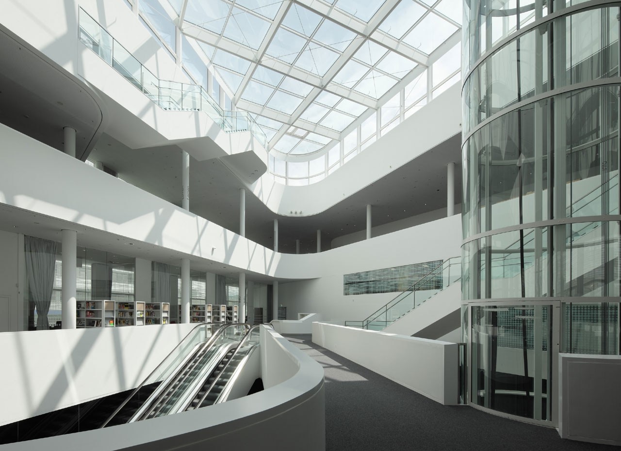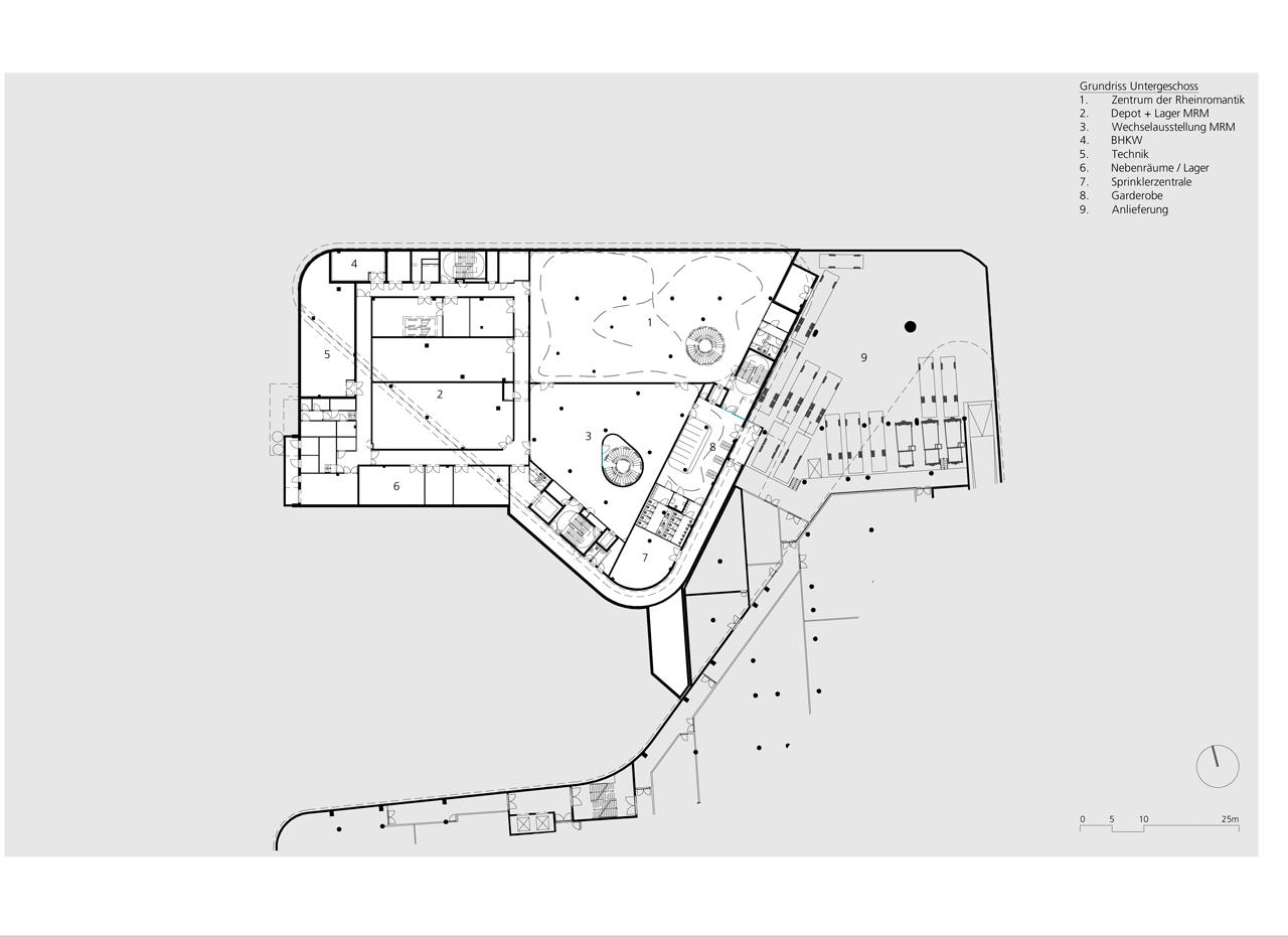 Sopra l’area comune al piano terra, le tre istituzioni si sono spartite i piani: al primo piano si trova la mostra permanente del Museo Mittelrhein, al secondo, al quarto e al quinto c’è la biblioteca, che ha accesso diretto alla terrazza sul tetto. Uno spazio aperto di 30 metri collega all’interno le istituzioni in senso verticale, permette l’ingresso della luce solare all’interno della costruzione e offre una maggiore varietà di prospettive.