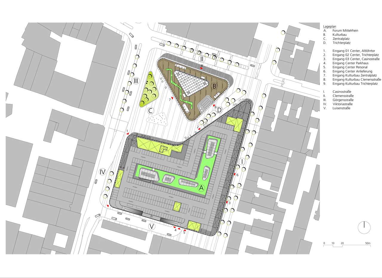 Il centro commerciale Forum Mittelrhein si presenta come una struttura stratificata orizzontalmente. A causa di questo formato particolare, il volume dell'edificio è ridotto pur mantenendo l’efficienza funzionale. Situato strategicamente all’interno del tessuto urbano, il centro commerciale ha ingressi spaziosi. La pianta è a base trapezoidale dai contorni lisci.