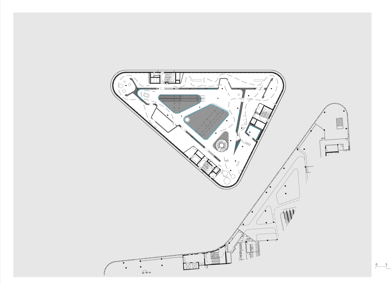Questa separazione di funzioni permette ai due edifici autonomia e funzionalità. A causa del posizionamento degli edifici, i passaggi pedonali sono stati riorganizzati in modo logico ed efficace.