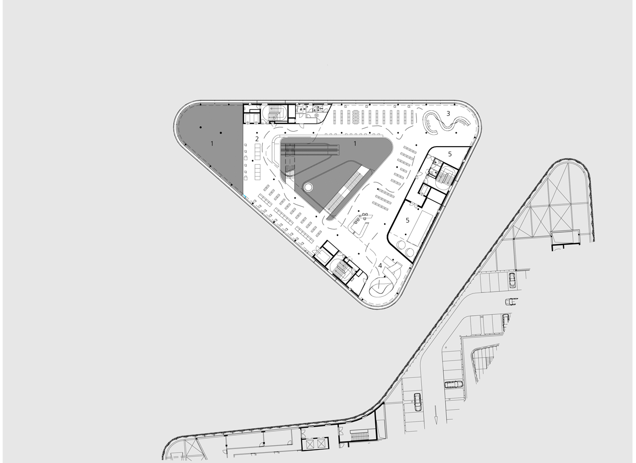 Le aree, unite dall’intersecarsi di scale mobili, rendono facile l’orientamento, dividono l’edificio e permettono l’ingresso della luce naturale all’interno. Sopra i negozi si trova un parcheggio che può ospitare fino a 740 auto. I parcheggi sono disposti attorno a un cortile centrale.