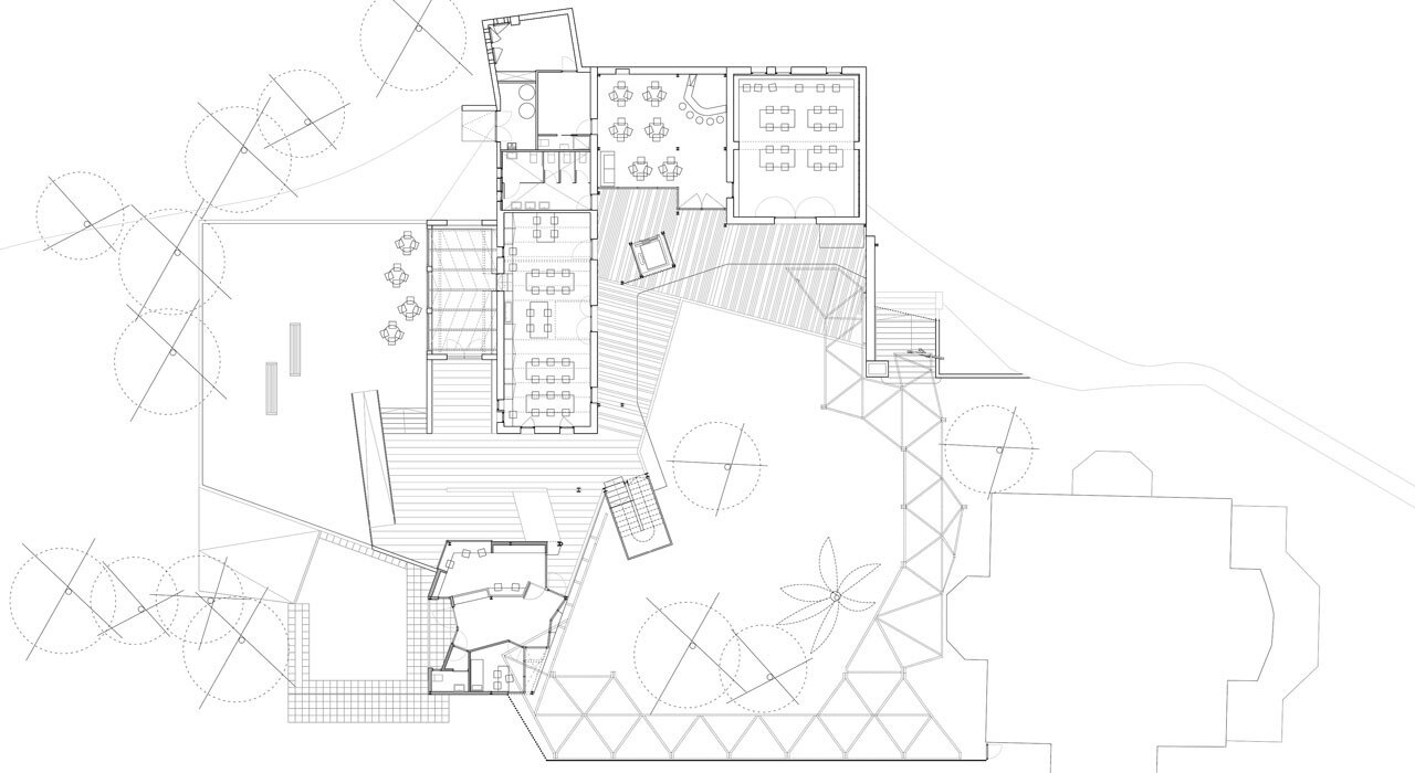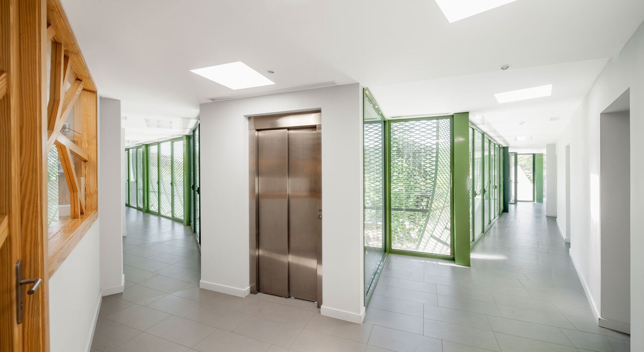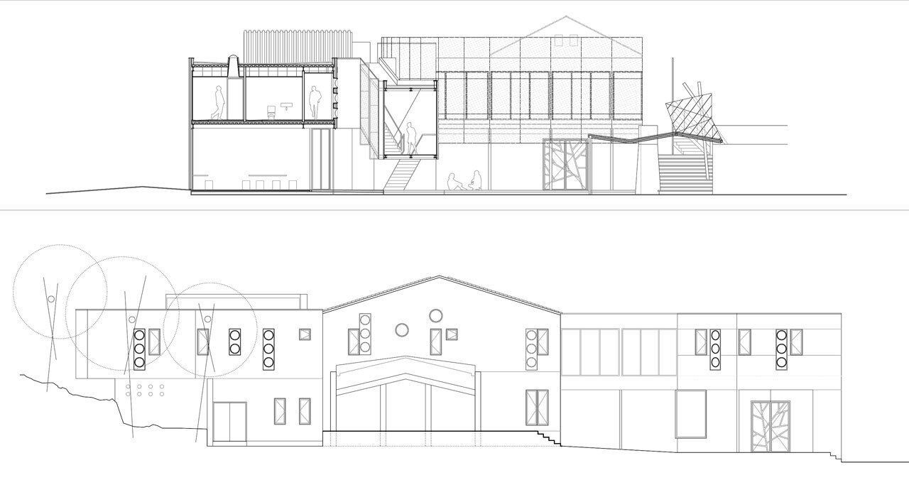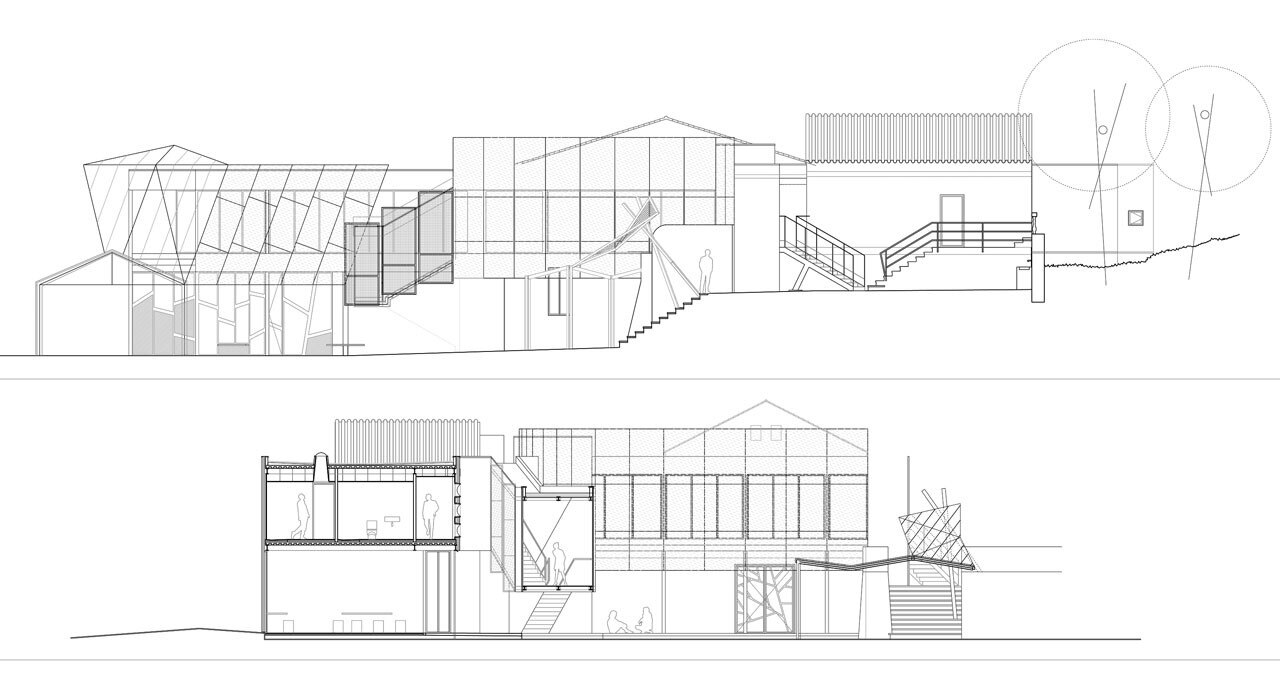 Nel progetto si è deciso di marcare la differenza tra ciò che è stato mantenuto e ciò che è di nuova costruzione. Pertanto, le facciate dei tetti a capanna del vecchio edificio sono stati ristrutturati con interventi minimi. Per lo stesso motivo, il tetto esterno della galleria a forma di T che collega entrambi gli edifici ha un aspetto molto diverso.