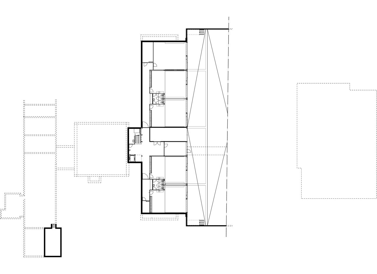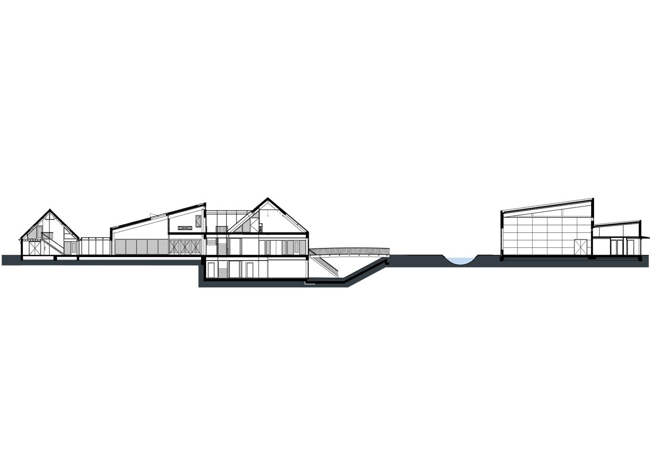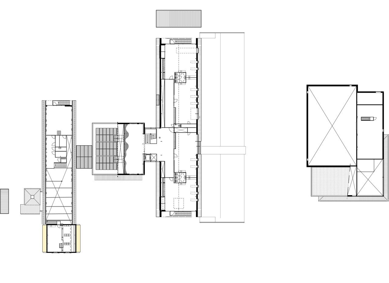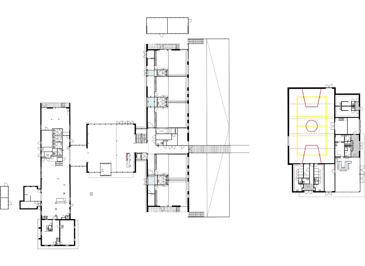 Nel vecchio casale sono state situate le funzioni amministrative della scuola, una sala pranzo per 100 bambini, una cucina, un asilo nido e un laboratorio per la manodopera locale. Gli impianti sportivi si trovano nell’edificio separato. Esso contiene una palestra, degli spogliatoi, la mensa e la clubhouse dell’associazione locale di pallamano. L’edificio è concepito come due volumi a incastro con tetti verdi inclinati, che rispettano la forma originaria e il carattere rurale della zona. Nella palestra si trova un’ampia finestra da cui si scorge il ponte che collega l'edificio principale, la scuola e le aree gioco esterne.