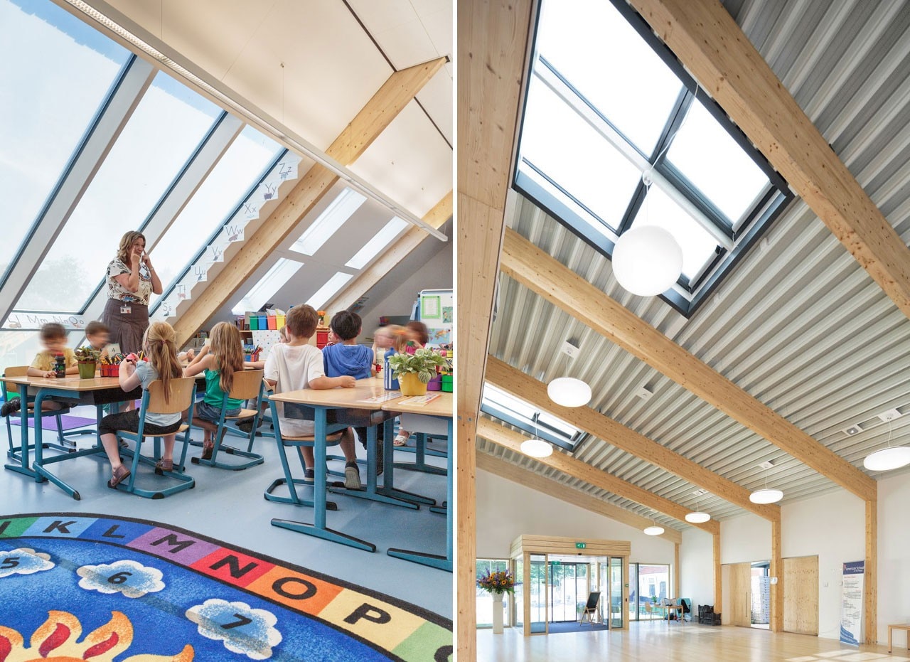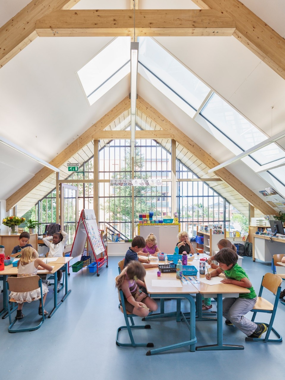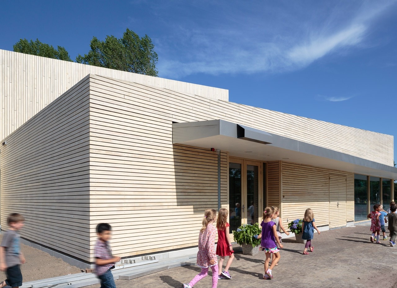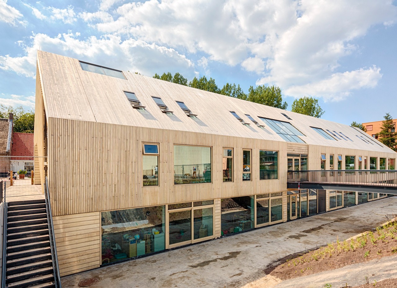 Come già detto, l’edificio è perfettamente integrato nell’ambiente e nel paesaggio circostante. La progettazione del paesaggio è stata fatta tenendo in considerazione gli obiettivi della scuola: un ambiente sano in cui i bambini imparano giocando anche le questioni di sostenibilità. Mediante l’utilizzo di acqua e materiali naturali si è voluto mostrare ai bambini come sia generata l’energia e si è voluto fare in modo che il contatto con questo tema fosse il più naturale possibile. L’edificio impiega energia solare, apparecchi a LED, sistemi di conservazione del freddo e del calore, sistemi di riutilizzo delle acque reflue e materiali d’intelaiatura come il rivestimento Accoya.