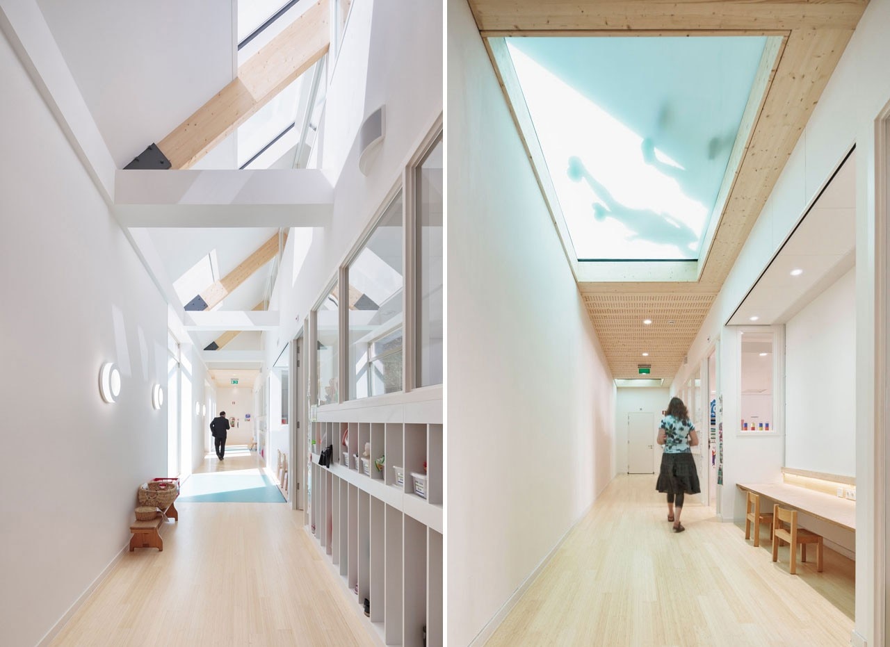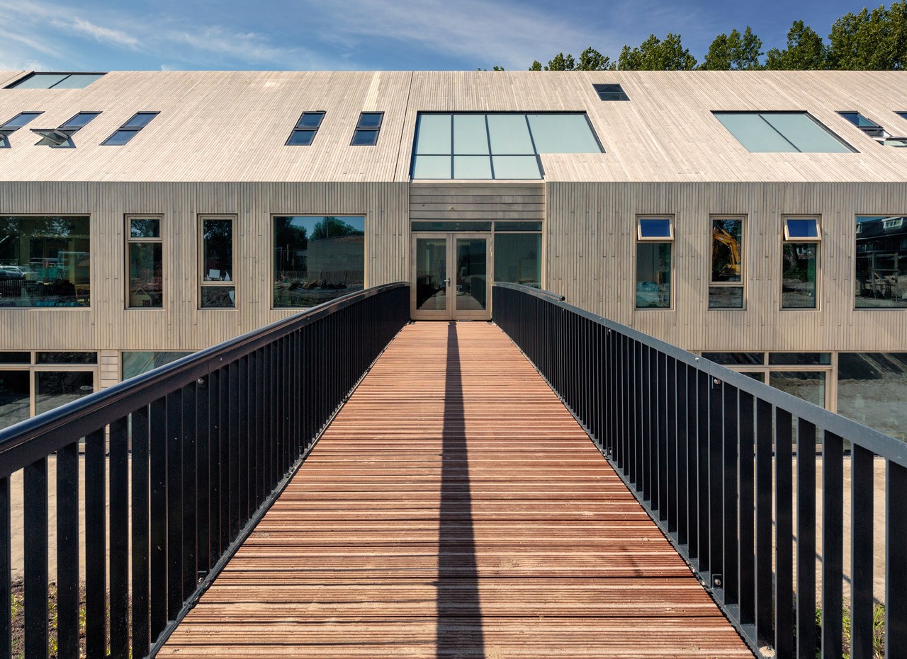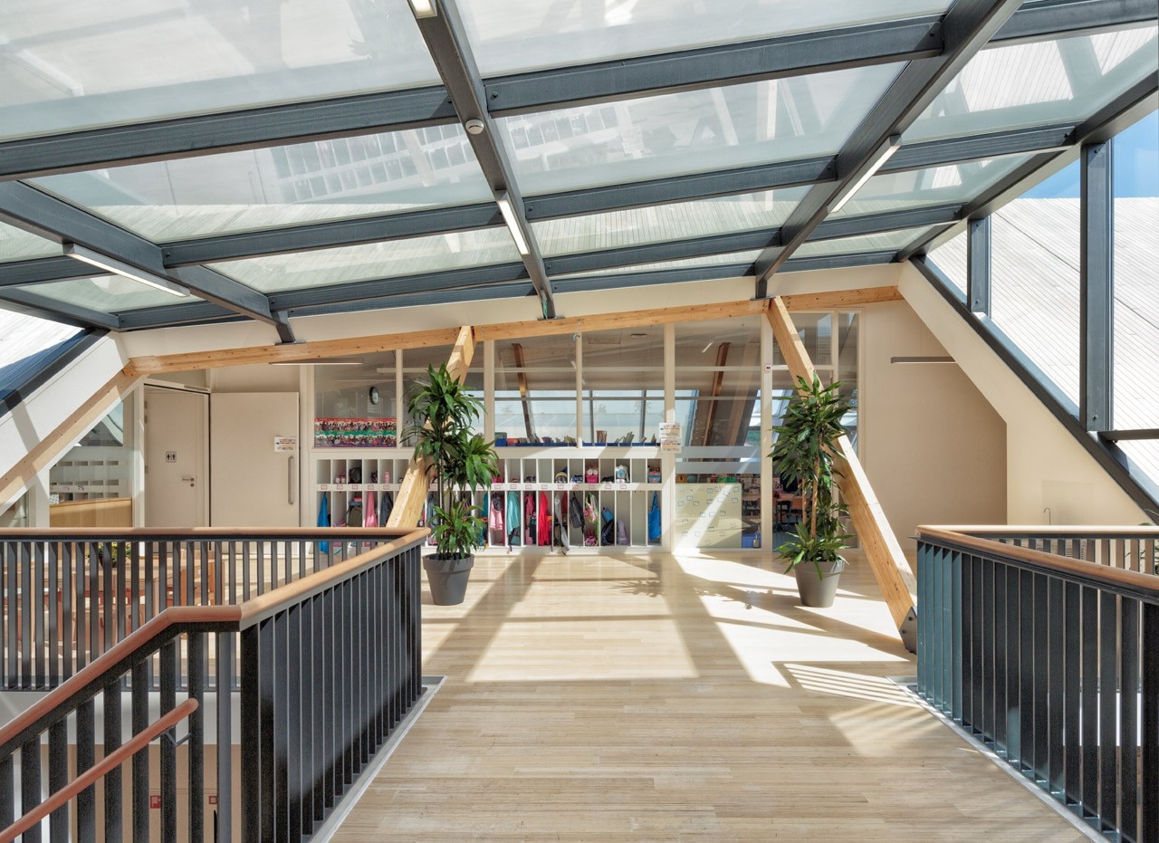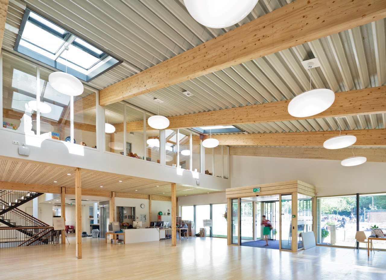 Come già detto, l’edificio è perfettamente integrato nell’ambiente e nel paesaggio circostante. La progettazione del paesaggio è stata fatta tenendo in considerazione gli obiettivi della scuola: un ambiente sano in cui i bambini imparano giocando anche le questioni di sostenibilità. Mediante l’utilizzo di acqua e materiali naturali si è voluto mostrare ai bambini come sia generata l’energia e si è voluto fare in modo che il contatto con questo tema fosse il più naturale possibile. L’edificio impiega energia solare, apparecchi a LED, sistemi di conservazione del freddo e del calore, sistemi di riutilizzo delle acque reflue e materiali d’intelaiatura come il rivestimento Accoya.