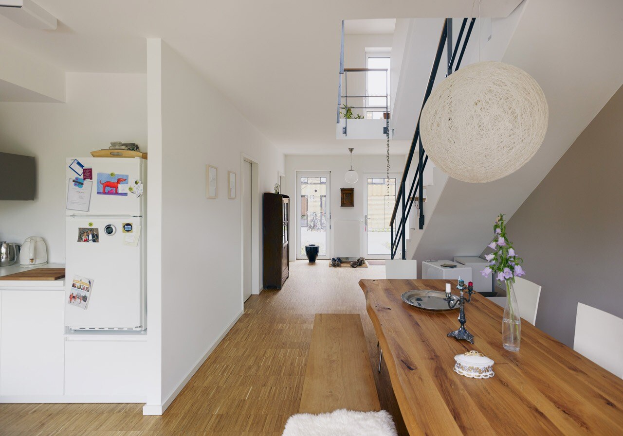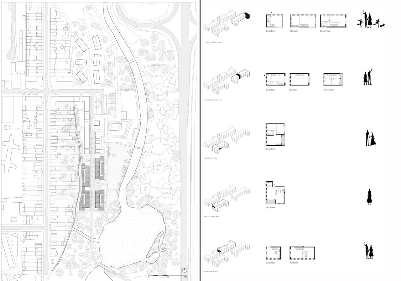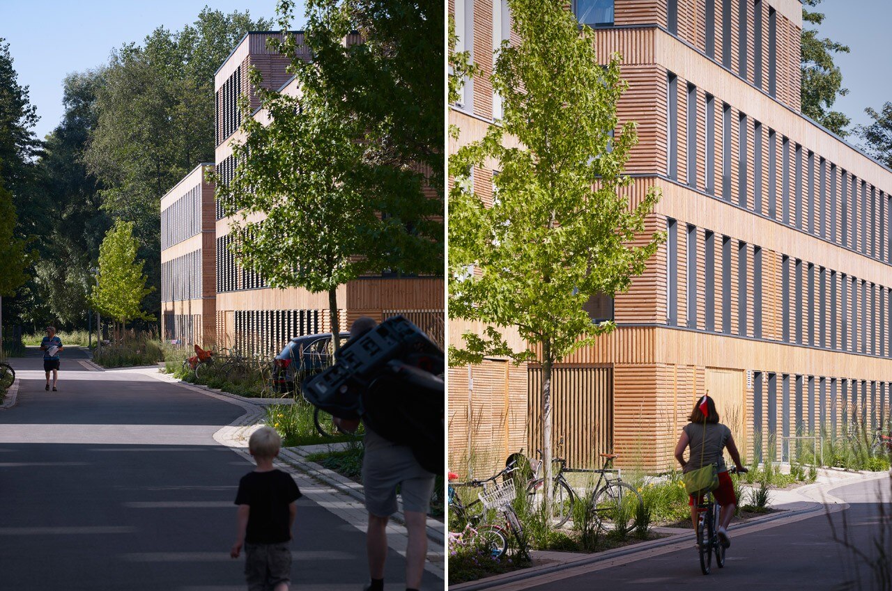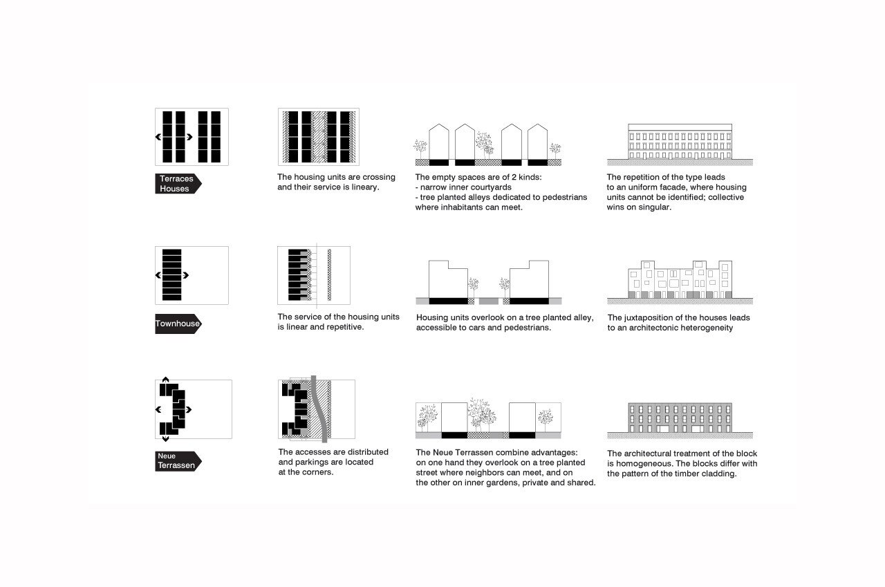 All'interno dei blocchi, le 33 unità abitative sono di due tipi: in linea e multilivello. Le 13 unità multilivello occupano 1 o 2 piani e hanno una superficie di 50-90 mq. Ciascuna di esse ha accesso diretto a un giardino con terrazza o a una loggia. Le residenze al piano terra sono completamente accessibili e utilizzabili dalle persone con mobilità ridotta. Le 20 villette a schiera sono disposte su tre piani, godono di un giardino privato con terrazza e del doppio affaccio sulla strada e sul cortile. Orientamento e superficie variano a seconda del loro posizionamento all'interno del blocco. Su richiesta dei residenti sono stati integrati spazi di lavoro quali uffici, studi di progettazione grafica, studi medici e altro. Altri elementi spaziali, come il posizionamento del vano scala, l'accesso alla cucina, il numero di camere e bagni sono stati scelti direttamente dai residenti.