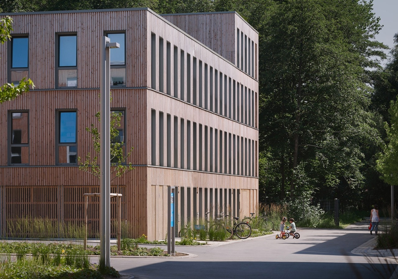 Dal punto di vista costruttivo, l'intervento utilizza una struttura a guscio in blocchi di cemento (Kalksandstein – Mauerwerk), che garantiscono un buon isolamento acustico, rivestiti da listelli di legno. I pannelli, costruiti fuori opera, misurano fino a 9x3 metri e combinano la struttura in legno di abete Douglas con gli elementi tessili di protezione dalla radiazione solare, gli infissin in PVC e i serramenti a triplo vetro. All'interno dei telaio trova inoltre posto uno strato isolante in cellulosa di 20 centimetri, che riempie gli spazi vuoti tra le pareti di cemento e il rivestimento.