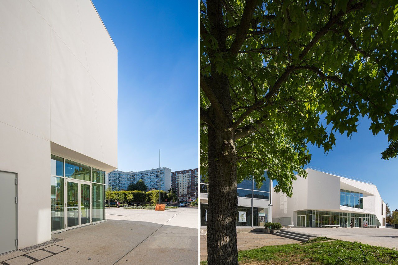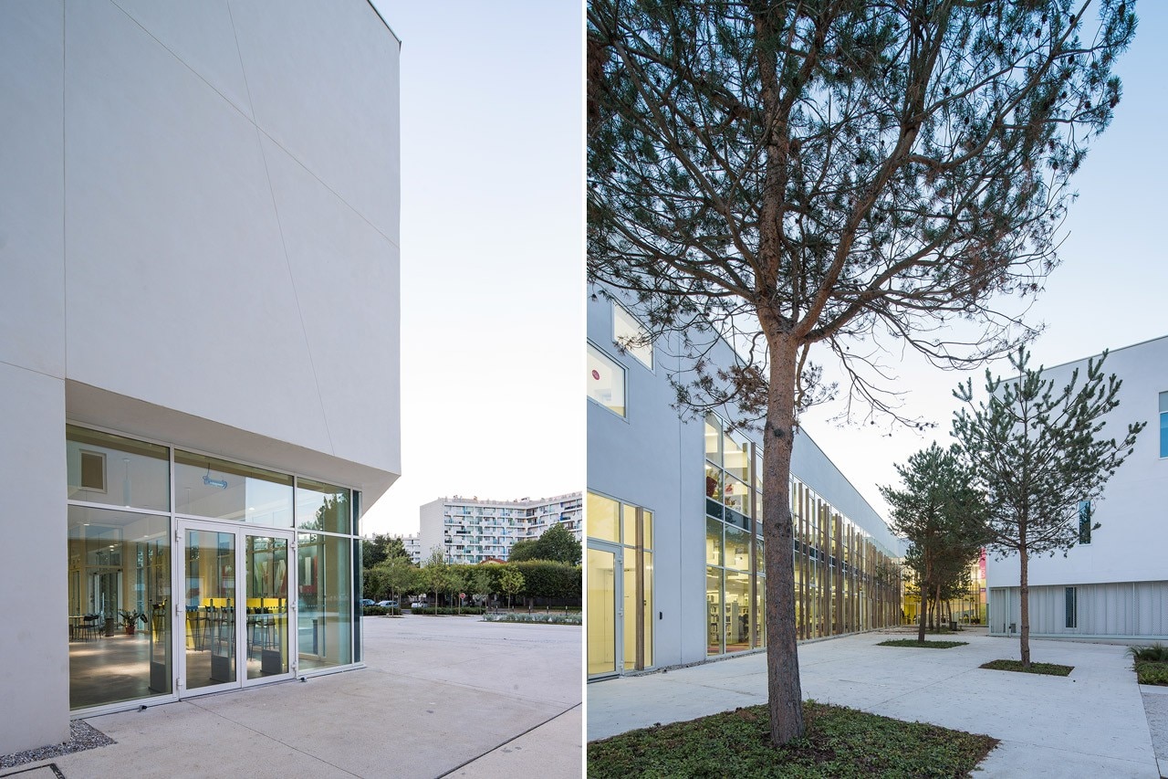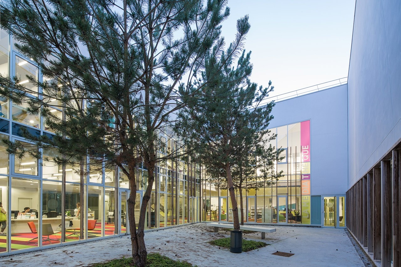 La continuità tra l’atrio della biblioteca e quello del centro culturale non è solamente visiva: i due volumi sono allineati in modo da stabilire connessioni funzionali, mentre la coerenza estetica è perseguita attraverso la ristrutturazione – a opera di Atelier Novembre – della facciata orientale del centro culturale, visibile dalla libreria multimediale.