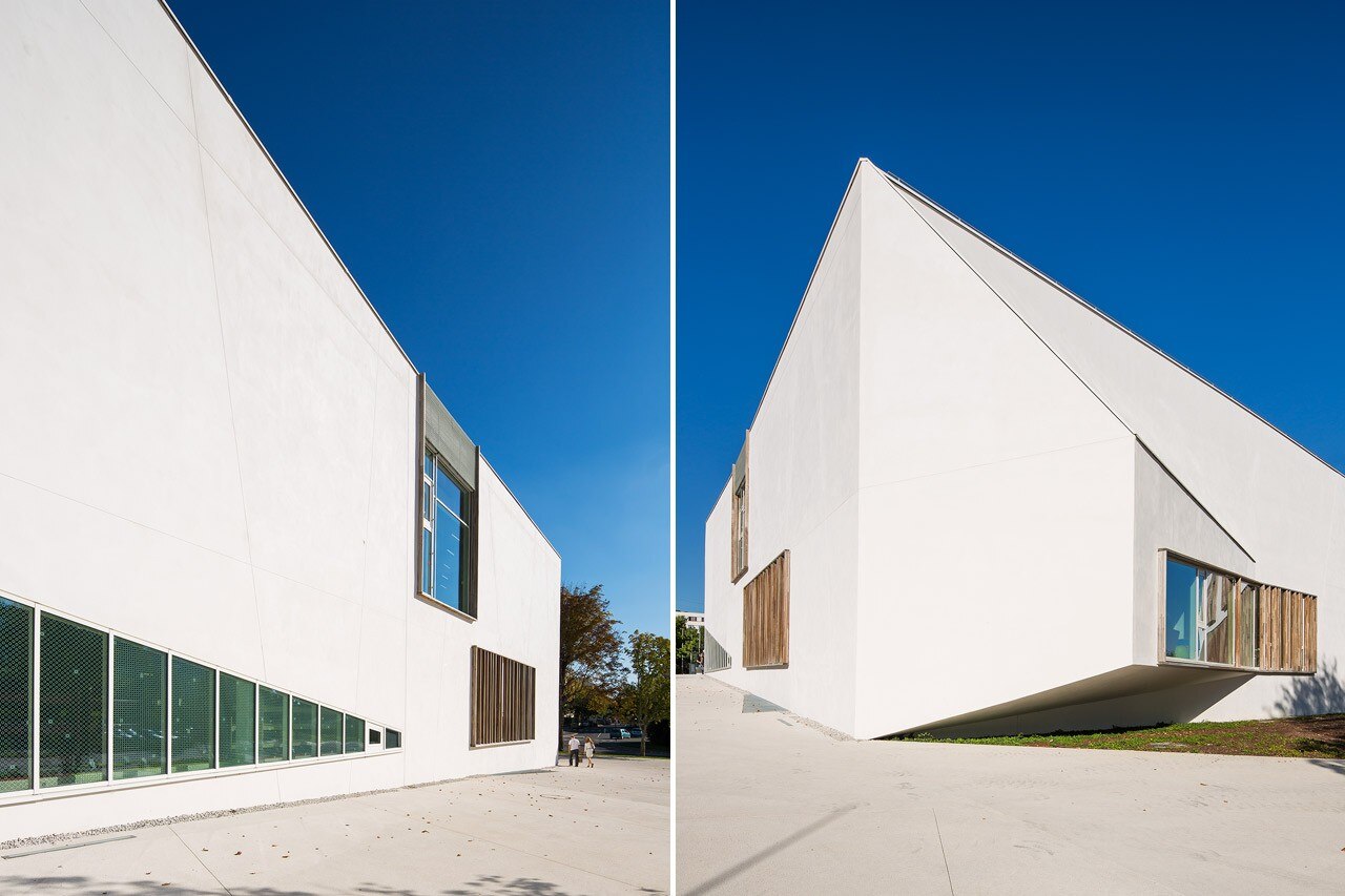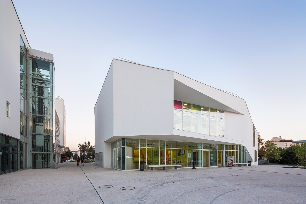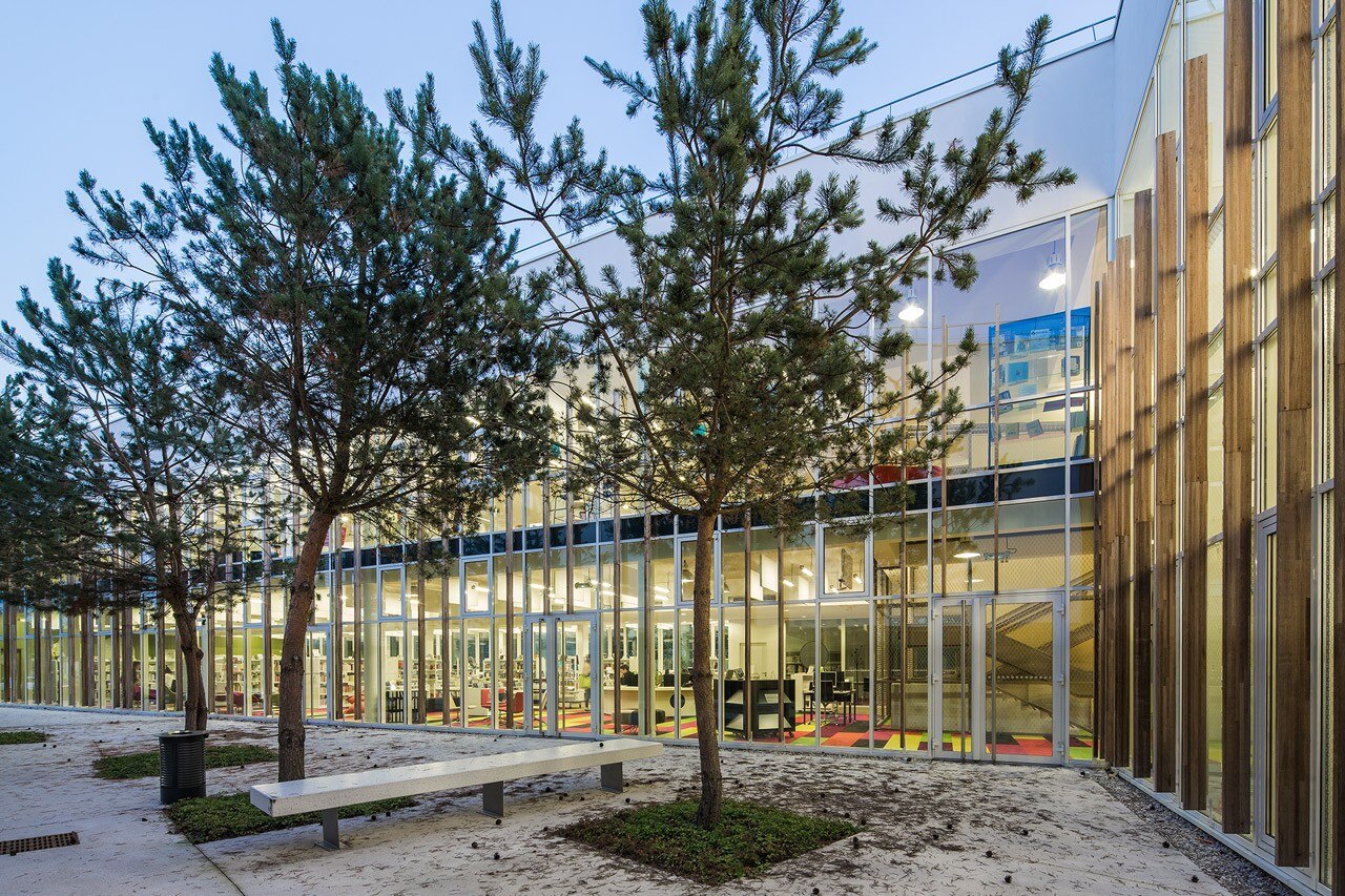 La continuità tra l’atrio della biblioteca e quello del centro culturale non è solamente visiva: i due volumi sono allineati in modo da stabilire connessioni funzionali, mentre la coerenza estetica è perseguita attraverso la ristrutturazione – a opera di Atelier Novembre – della facciata orientale del centro culturale, visibile dalla libreria multimediale.
