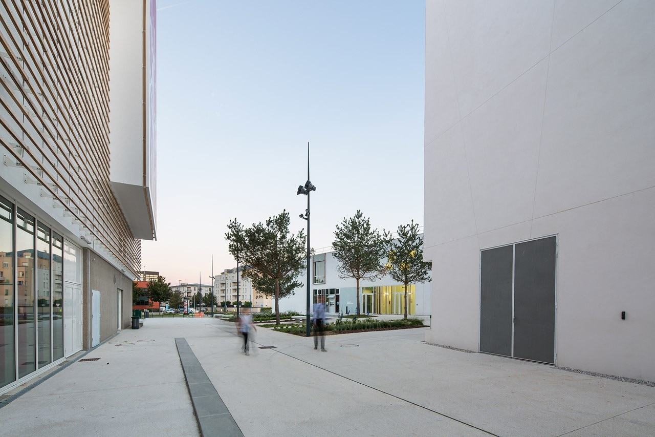 Le zone pedonali, piantumate con alberi pagoda giapponesi, pini silvestri, querce e faggi, fungono da portali per l’area e guidano i visitatori agli ingressi dei due centri culturali. Le aree esterne offrono ai residenti spazi di sosta all’aperto, da cui godere del giardino lineare.