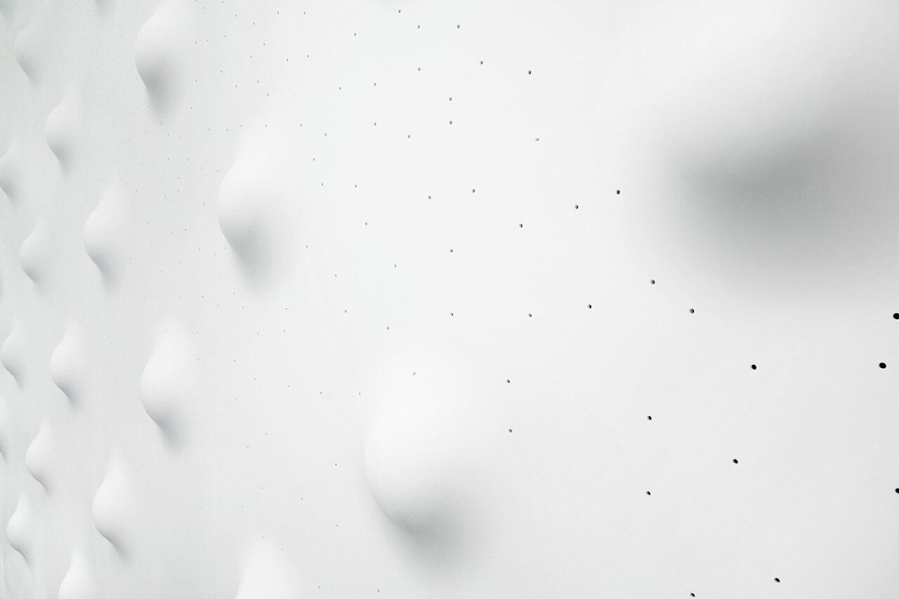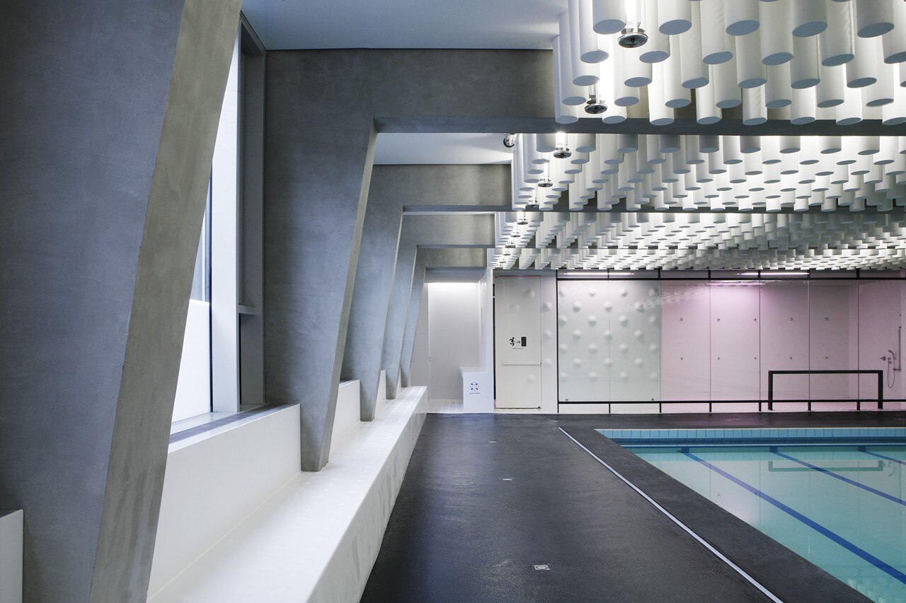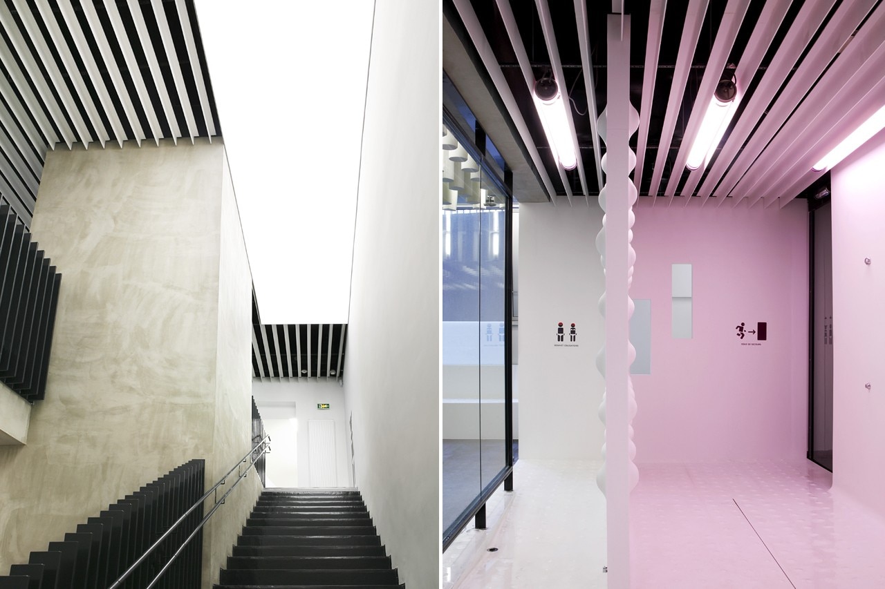 Il ritmo visivo è prodotto in armonia con le travi in calcestruzzo a vista preesistenti. Varie esperienze sensoriali avvengono in uno spazio minimalista.