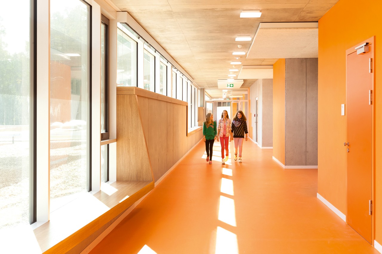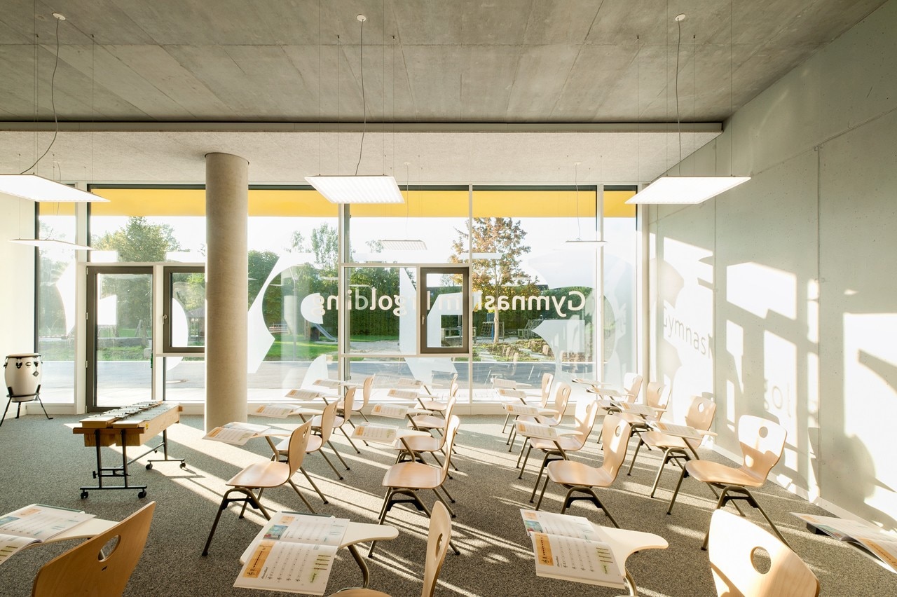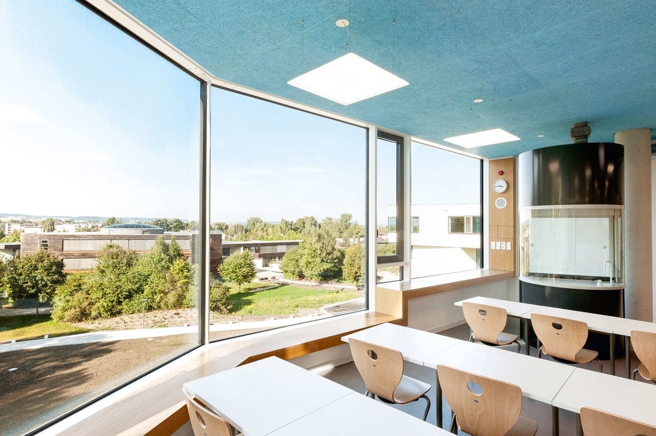 Per ottimizzare l’apporto di luce diurna, le aule affacciate a nord utilizzano un sistema di direzionamento della luce che consente di ricevere illuminazione dal corridoio a sud, riducendo così la necessità di luce artificiale.