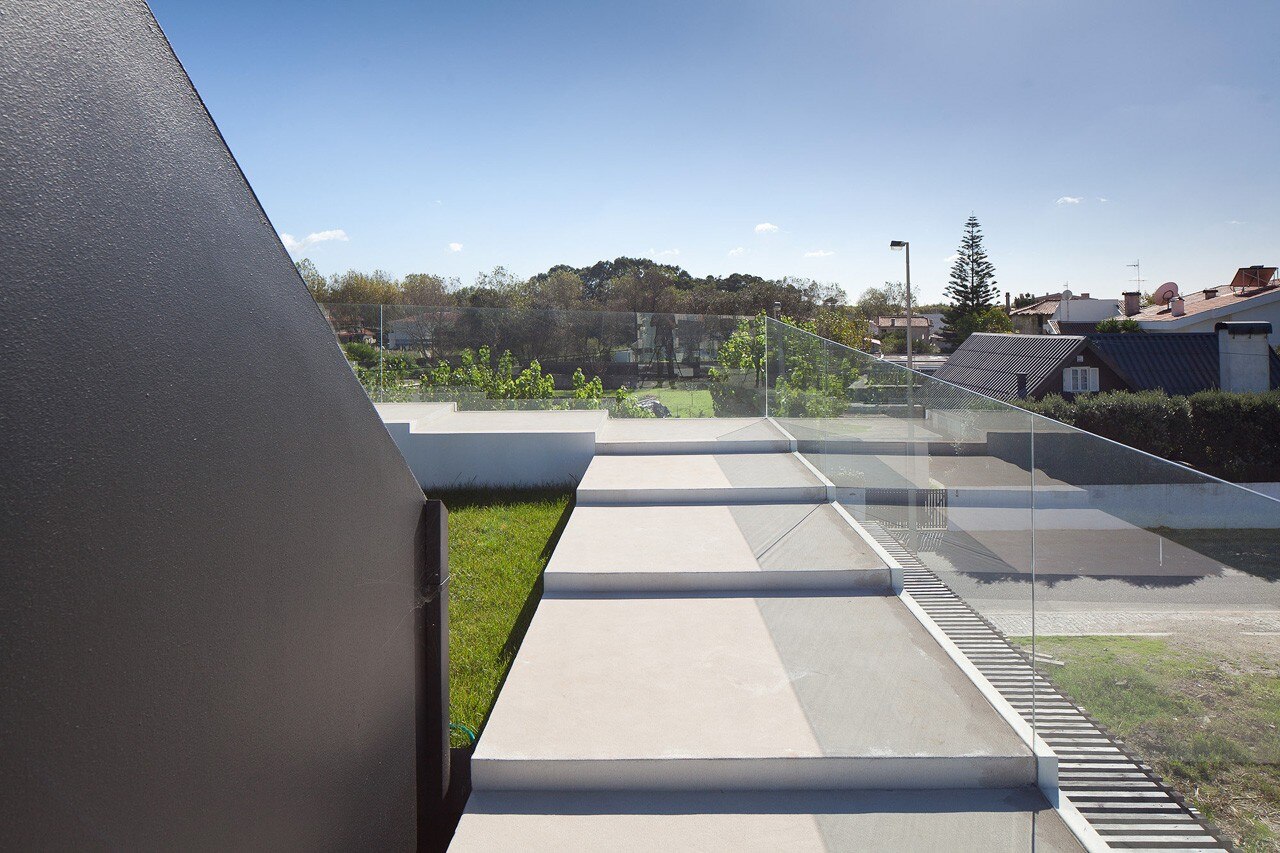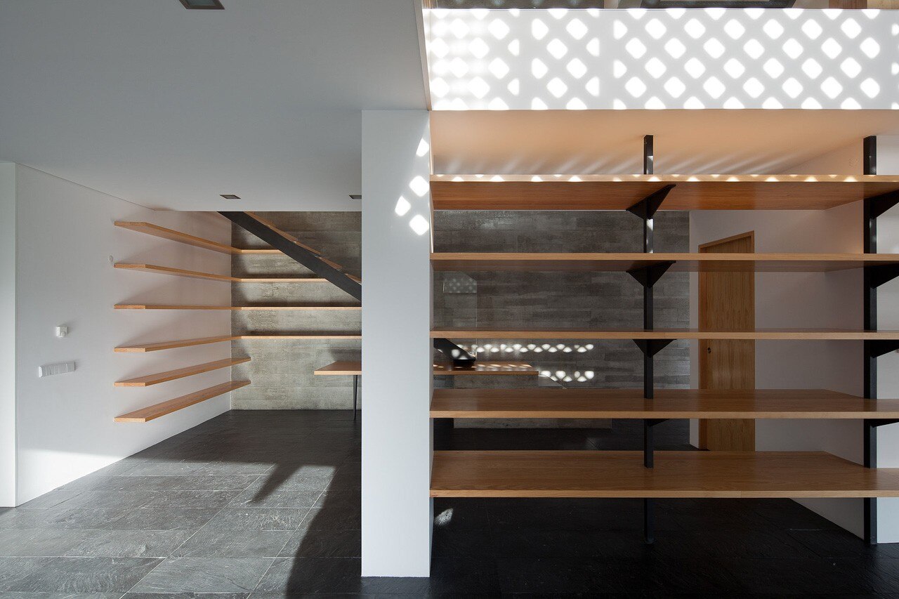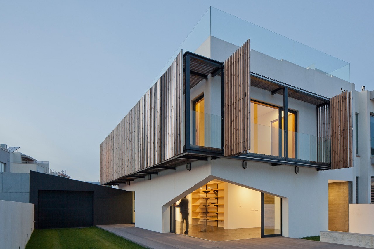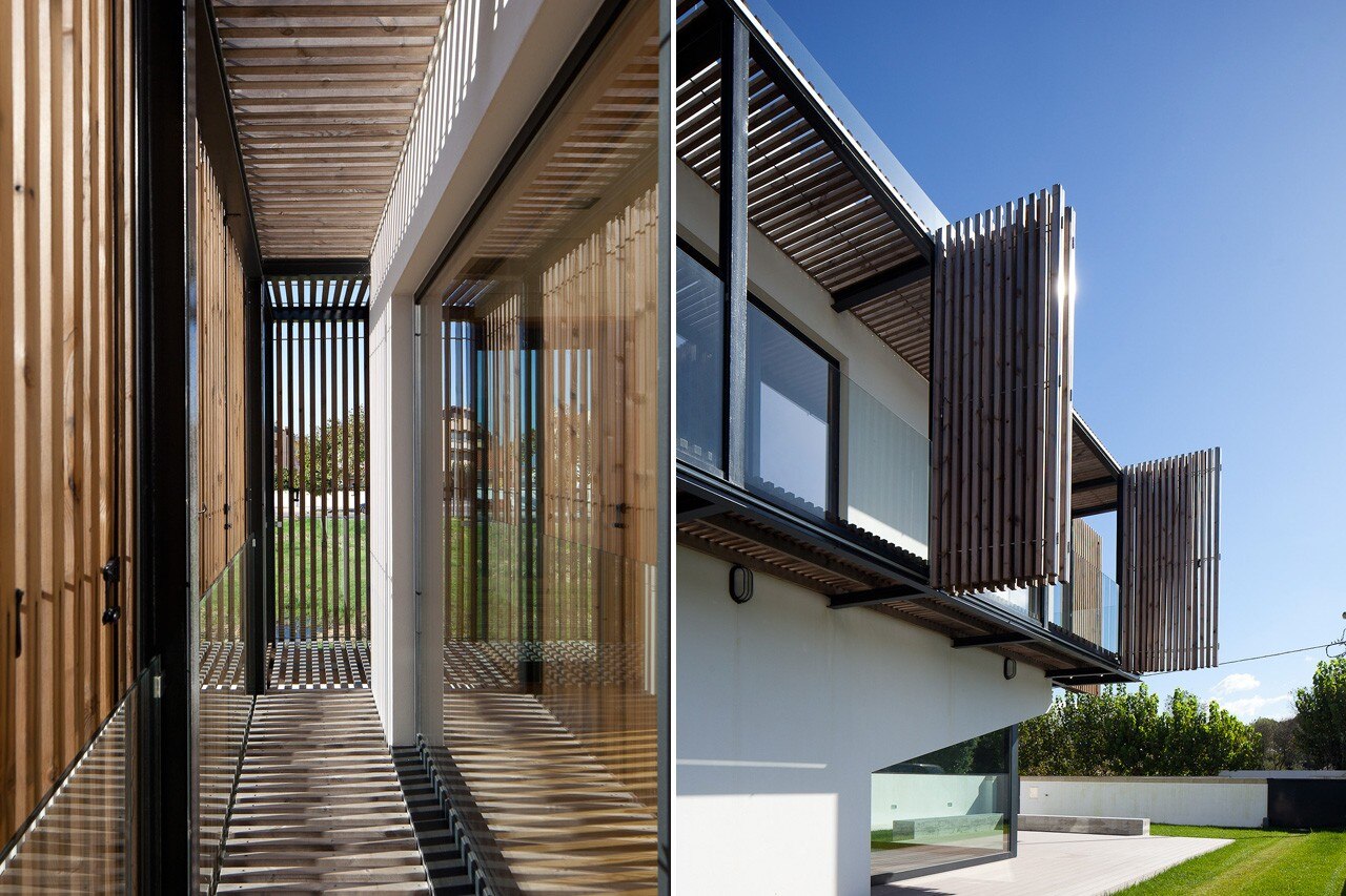 Il primo piano ospita tre camere da letto collegate tra loro dal balcone unico che svolge la doppia funzione di controllo della luce e della privacy grazie al sistema di schermatura in legno sostenuto da una struttura metallica.