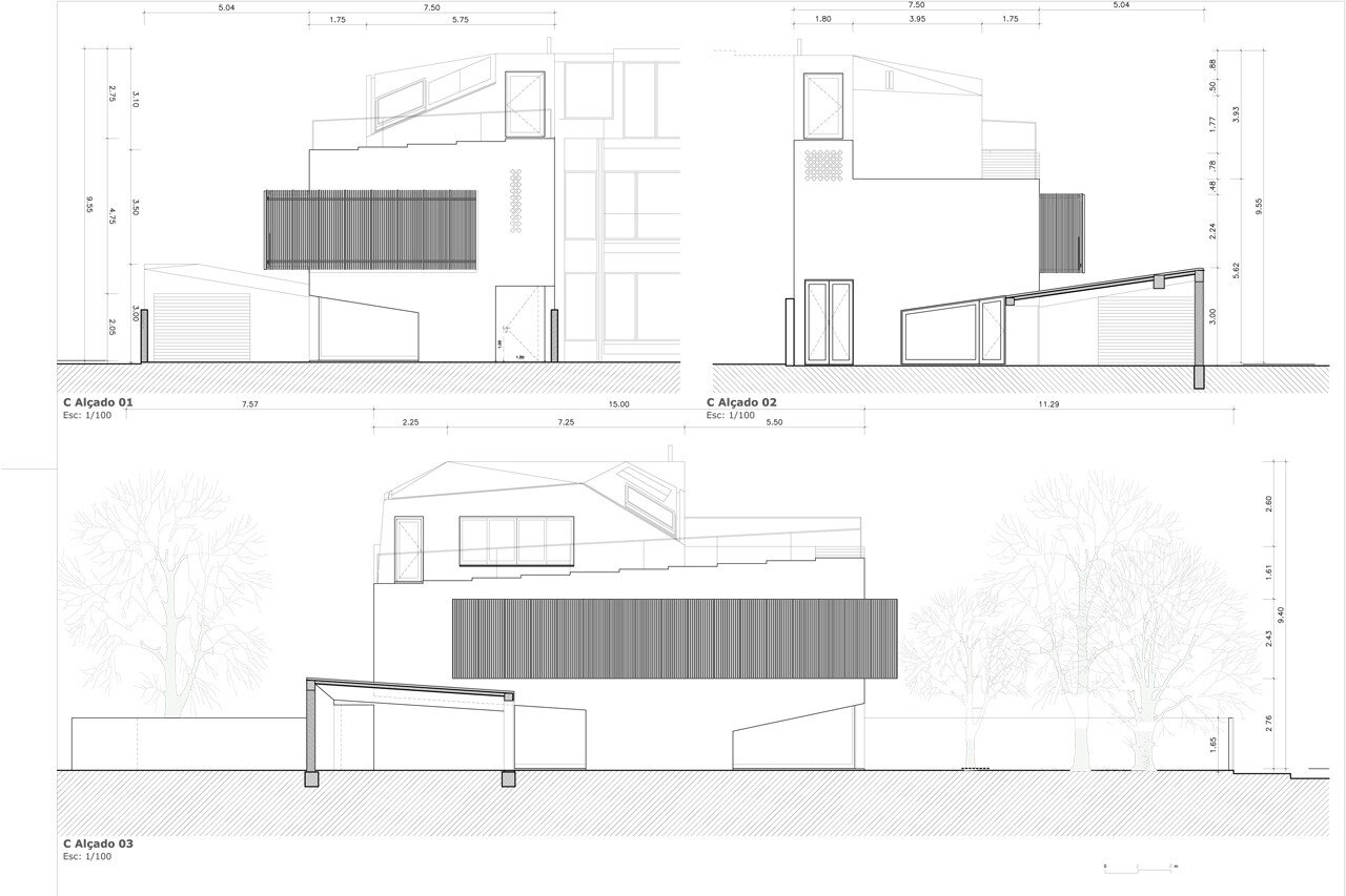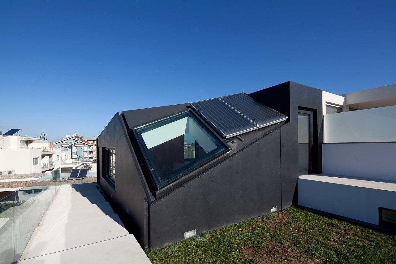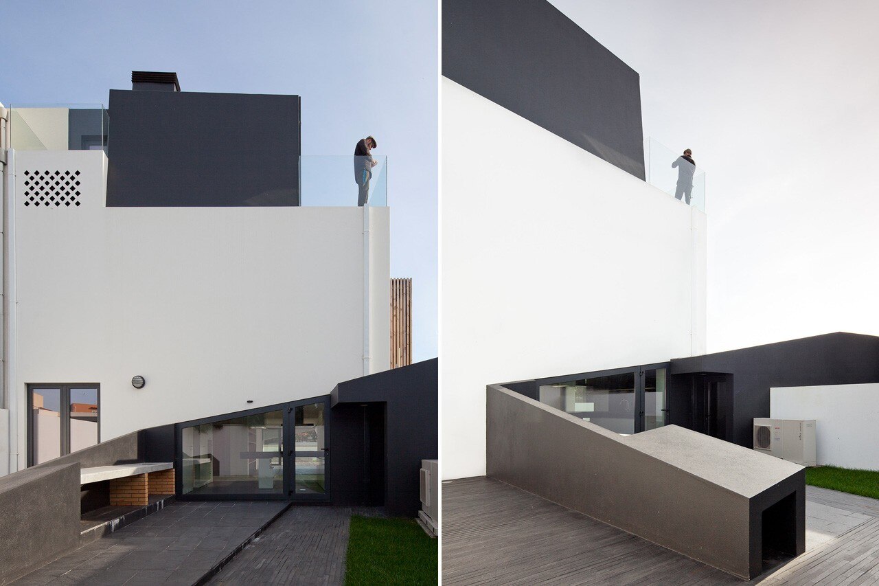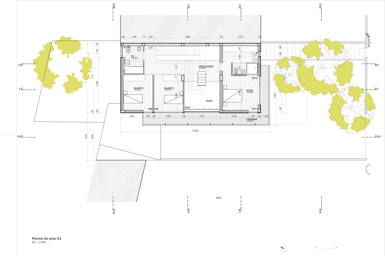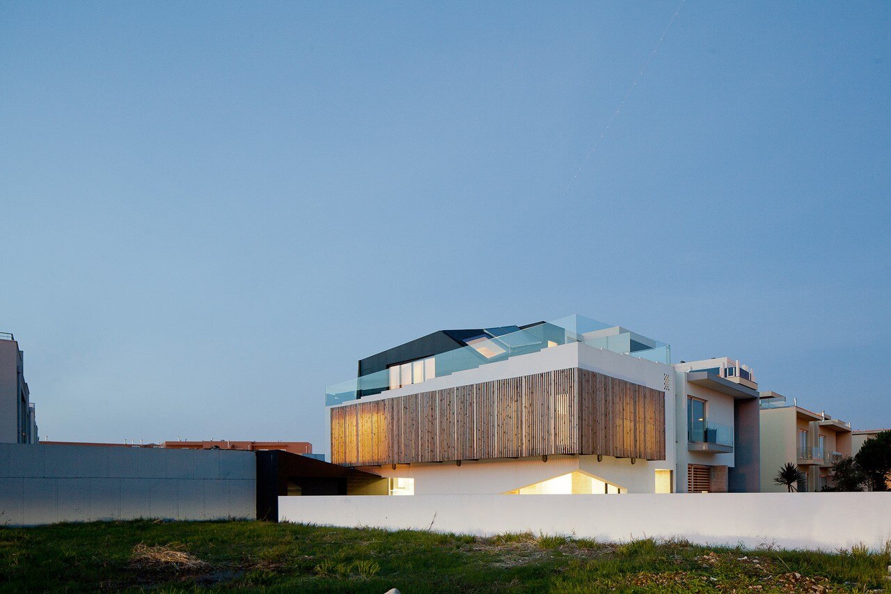 Il primo piano ospita tre camere da letto collegate tra loro dal balcone unico che svolge la doppia funzione di controllo della luce e della privacy grazie al sistema di schermatura in legno sostenuto da una struttura metallica.