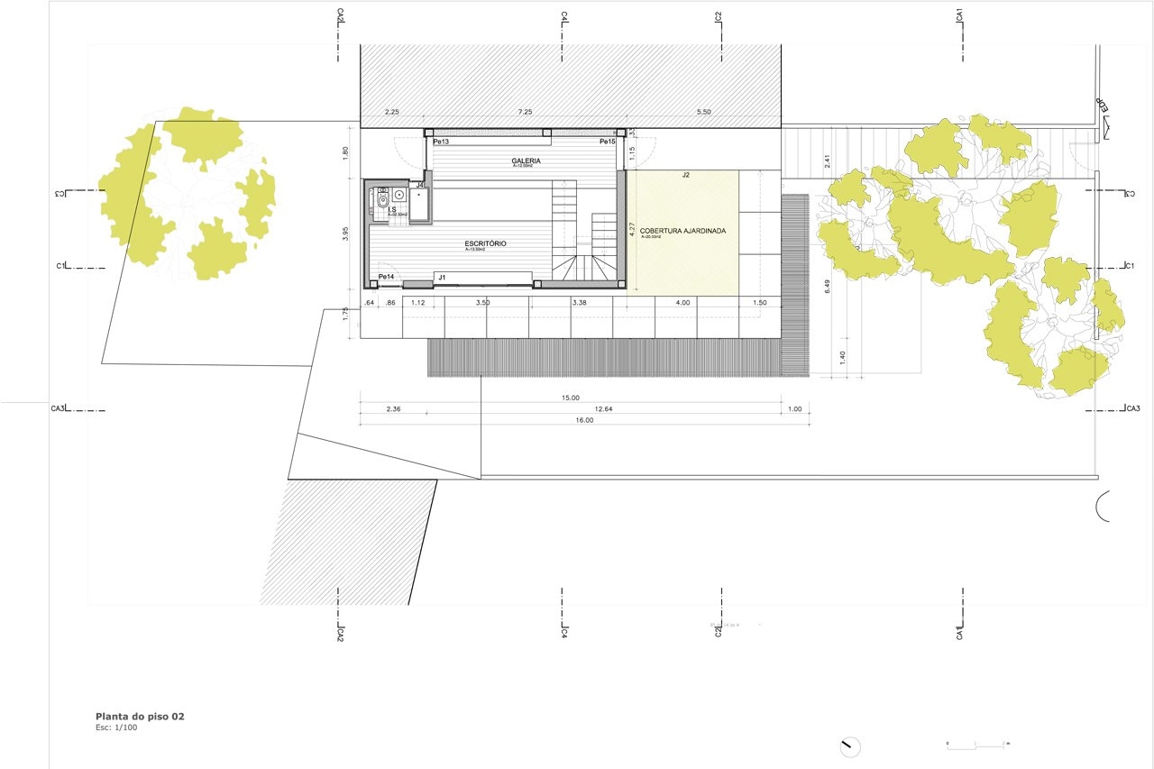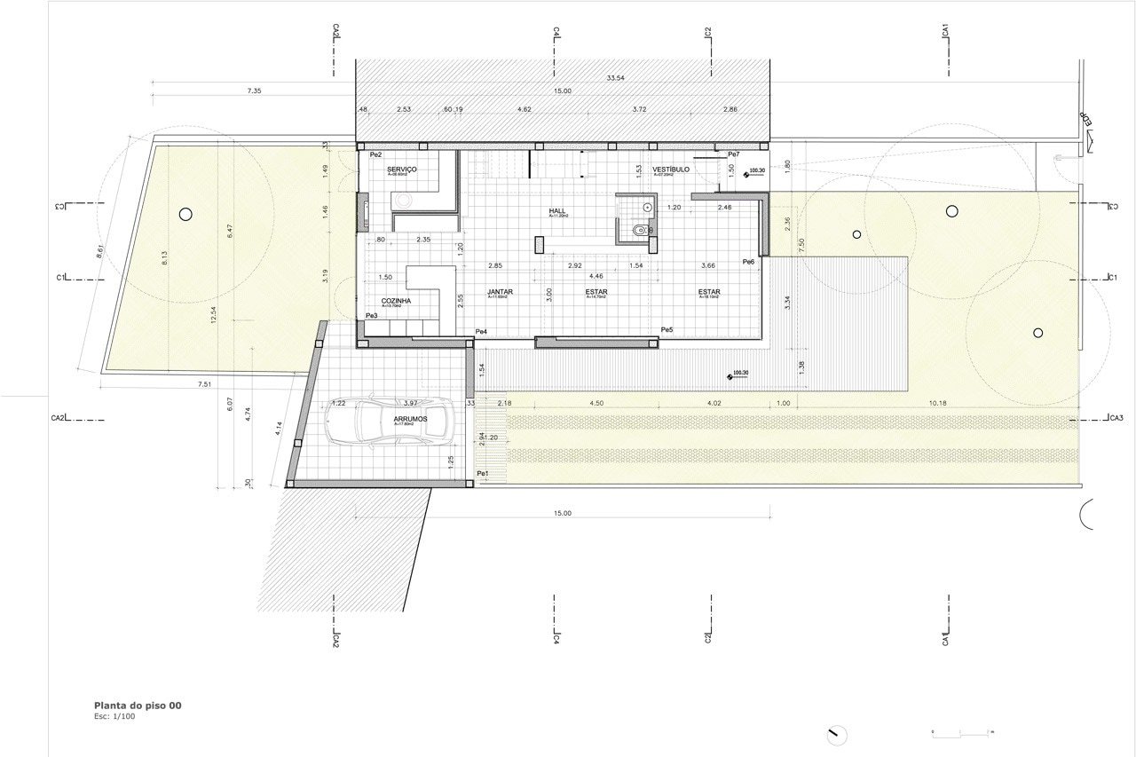 Al piano terra si trovano gli ambienti più pubblici della casa, gli spazi di servizio e, a nord-ovest, il volume del garage. Il piano è pensato come un ambiente unico in direzione nord-sud, in modo che tutti gli spazi funzionali affaccino sull’esterno.