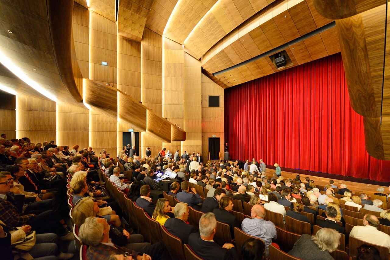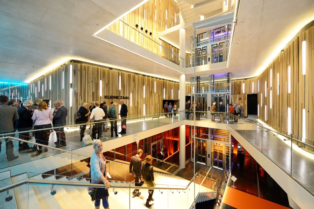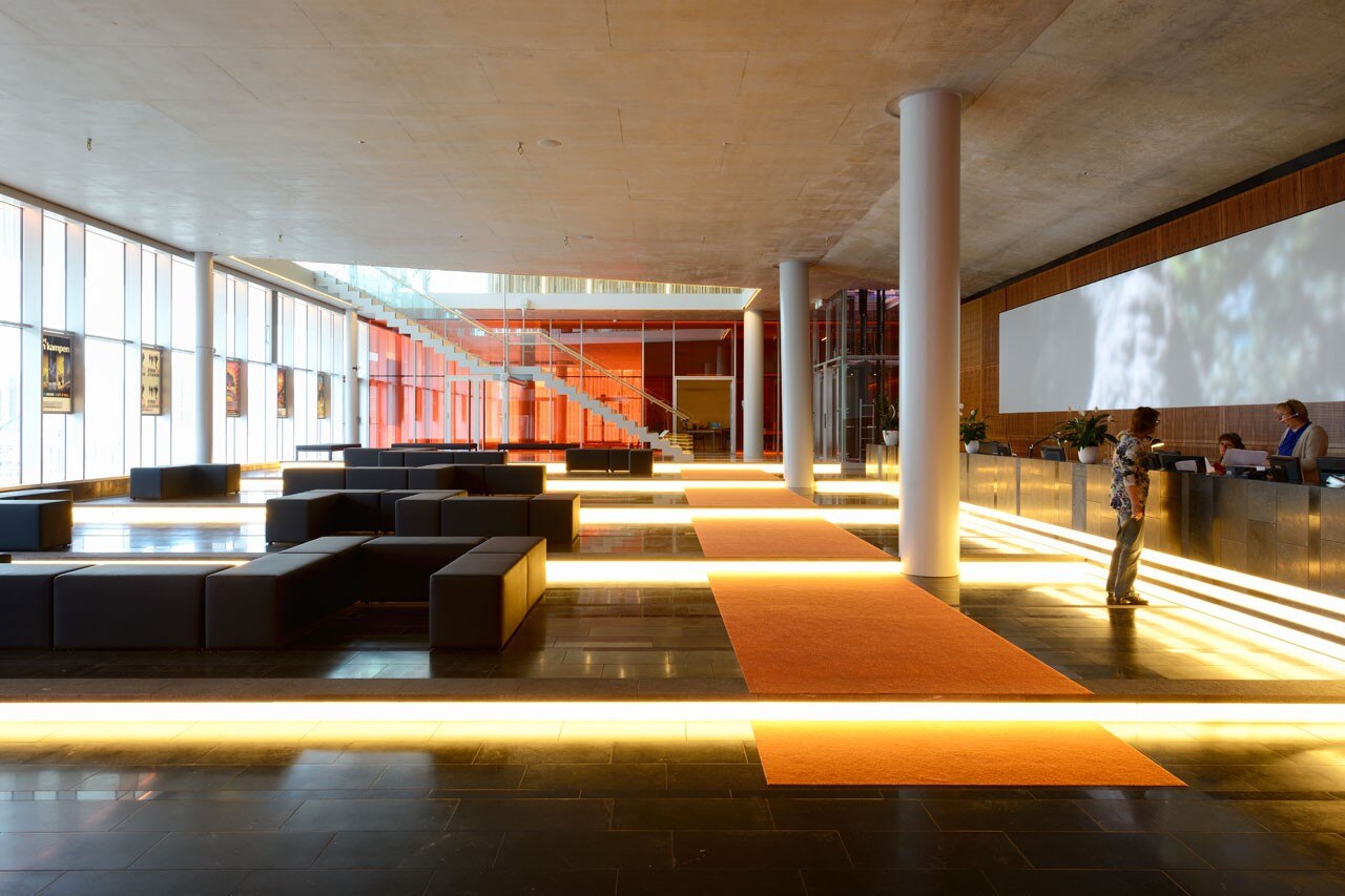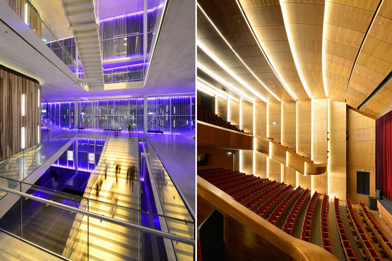 Completano il complesso tre foyer e il caffè del teatro che guarda sulla piazza centrale della città. Le vetrate esterne dell’area foyer sono rivestite da una finitura stampata che crea l’illusione del sipario di un palcoscenico, utile a ridurre il livello di penetrazione della luce dalle facciate esposte a sud e a est. Dopo il tramonto la facciata è illuminata con un impianto LED a risparmio energetico.