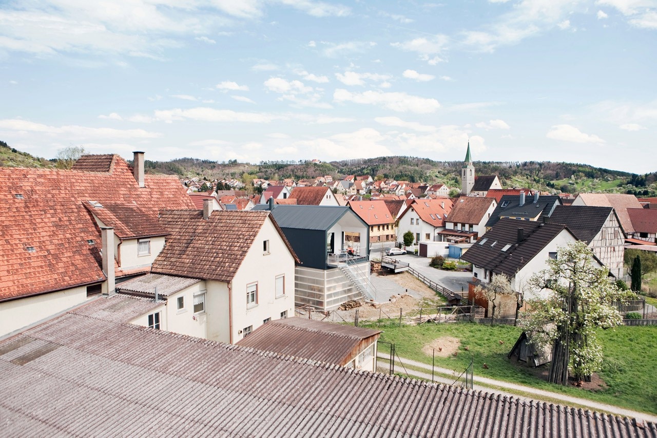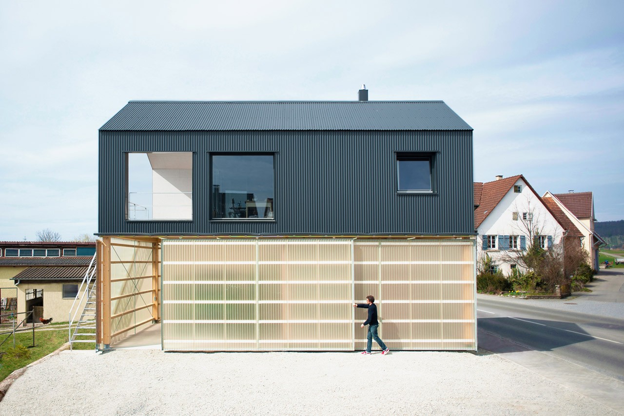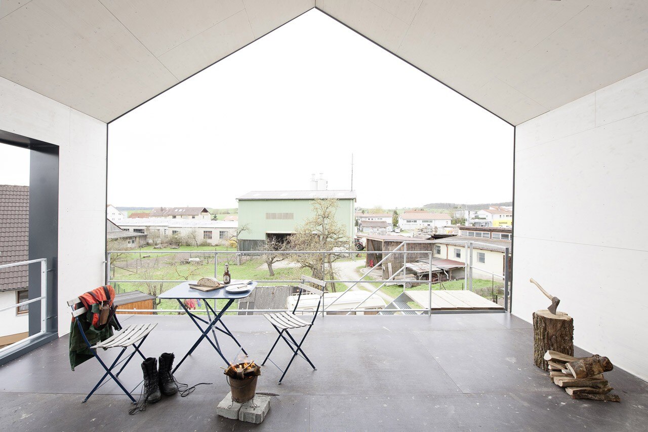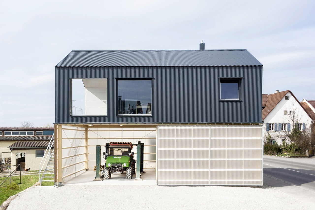 Lo spazio abitativo si presenta, con la sua facciata color antracite, come un volume monolitico. La disposizione delle finestre e un’ampia loggia orientata a sud permettono di godere della vista sul paesaggio circostante. I materiali scelti per la facciata e gli interni sottolineano il concetto di design pragmatico e ridotto: una casa che si avvicina più alla tipologia della residenza colonica o della fattoria piuttosto che a quella dell’abitazione tradizionale.