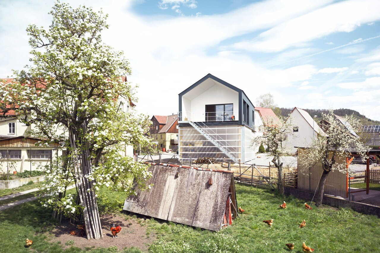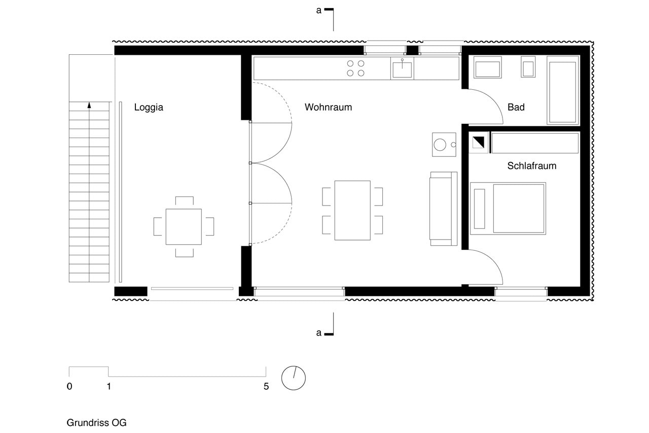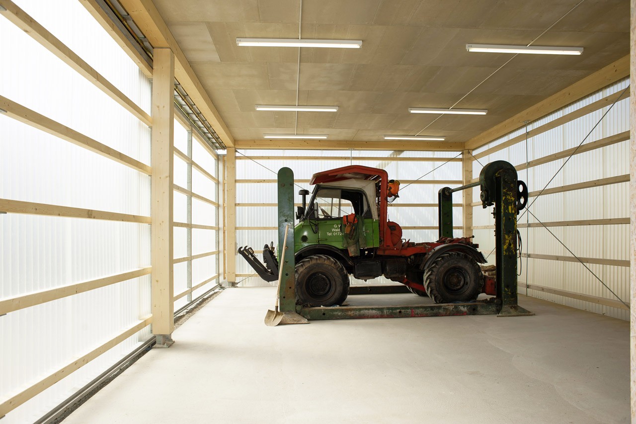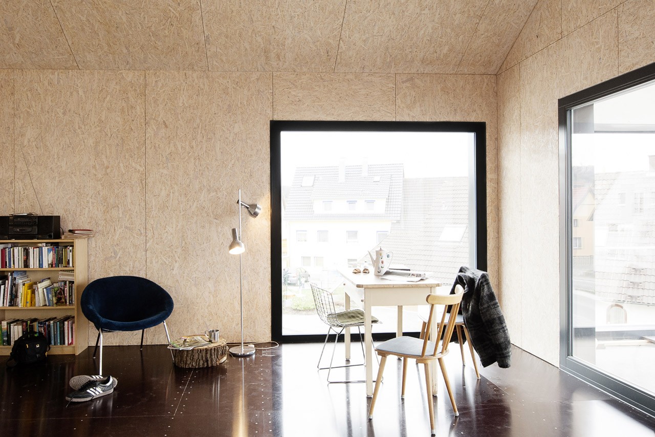 Lo spazio abitativo si presenta, con la sua facciata color antracite, come un volume monolitico. La disposizione delle finestre e un’ampia loggia orientata a sud permettono di godere della vista sul paesaggio circostante. I materiali scelti per la facciata e gli interni sottolineano il concetto di design pragmatico e ridotto: una casa che si avvicina più alla tipologia della residenza colonica o della fattoria piuttosto che a quella dell’abitazione tradizionale.