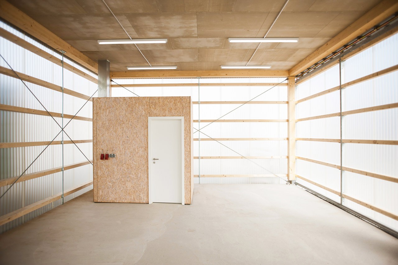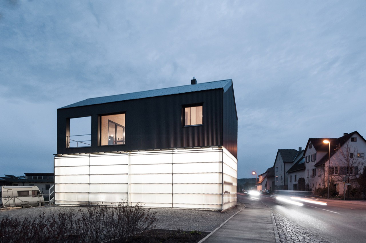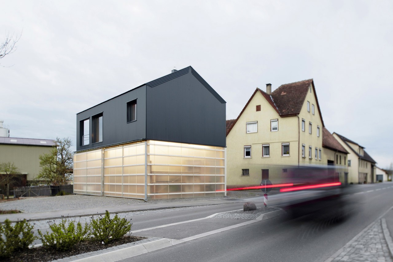 Il cambiamento d’uso si riflette nel prospetto: la parte inferiore, dedicata all’officina, è rivestita con pannelli di policarbonato traslucido. L’area di lavoro è così illuminata di luce naturale durante il giorno, mentre di notte si trasforma in una scatola luminosa che brilla nel quartiere.