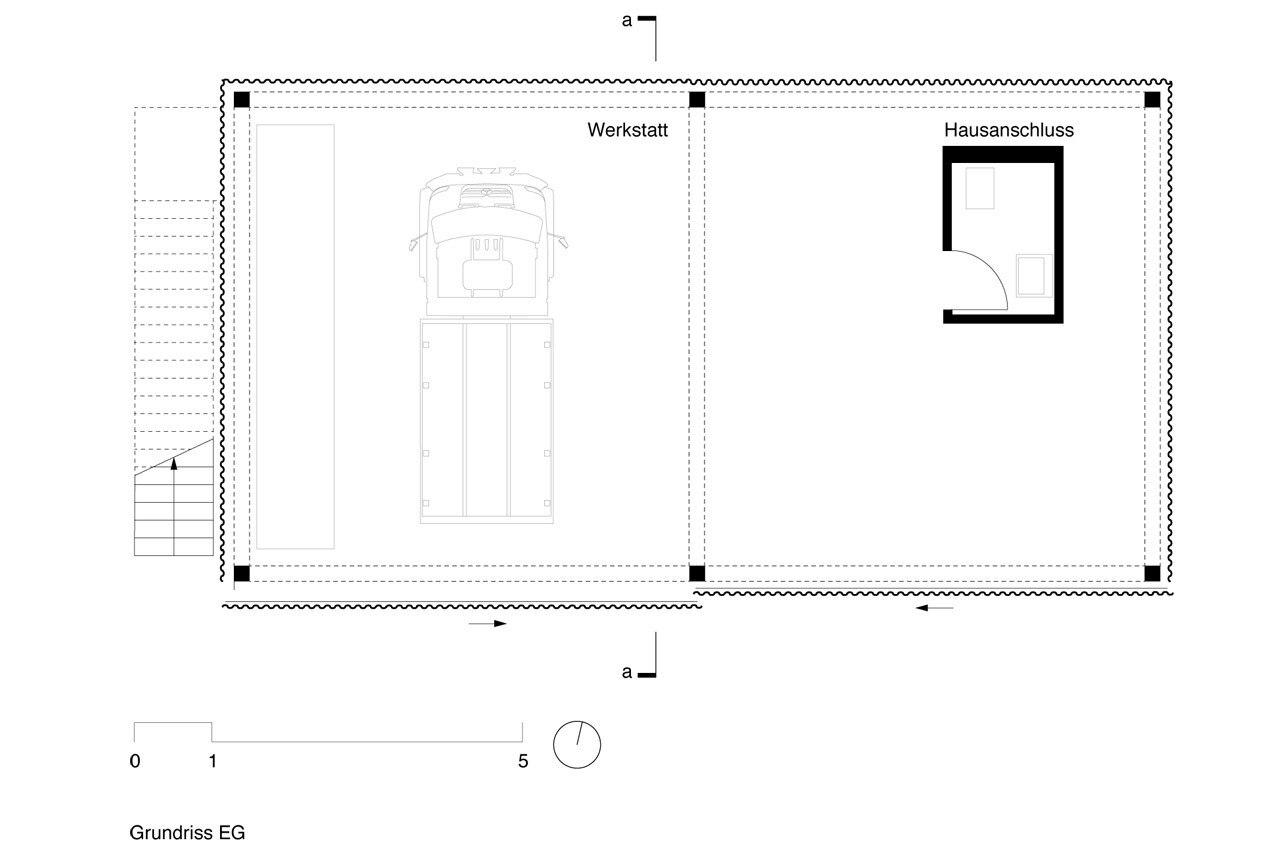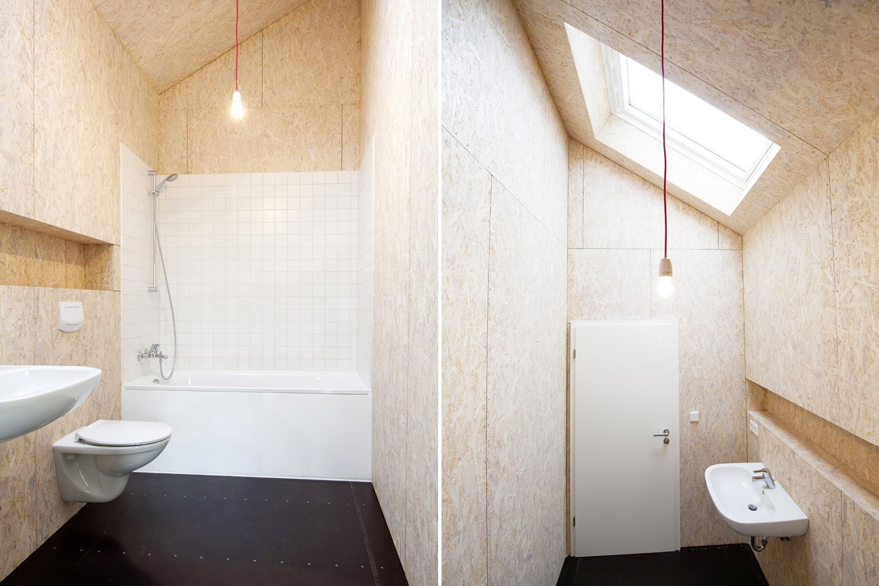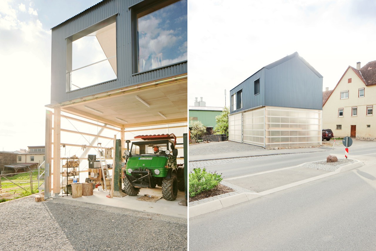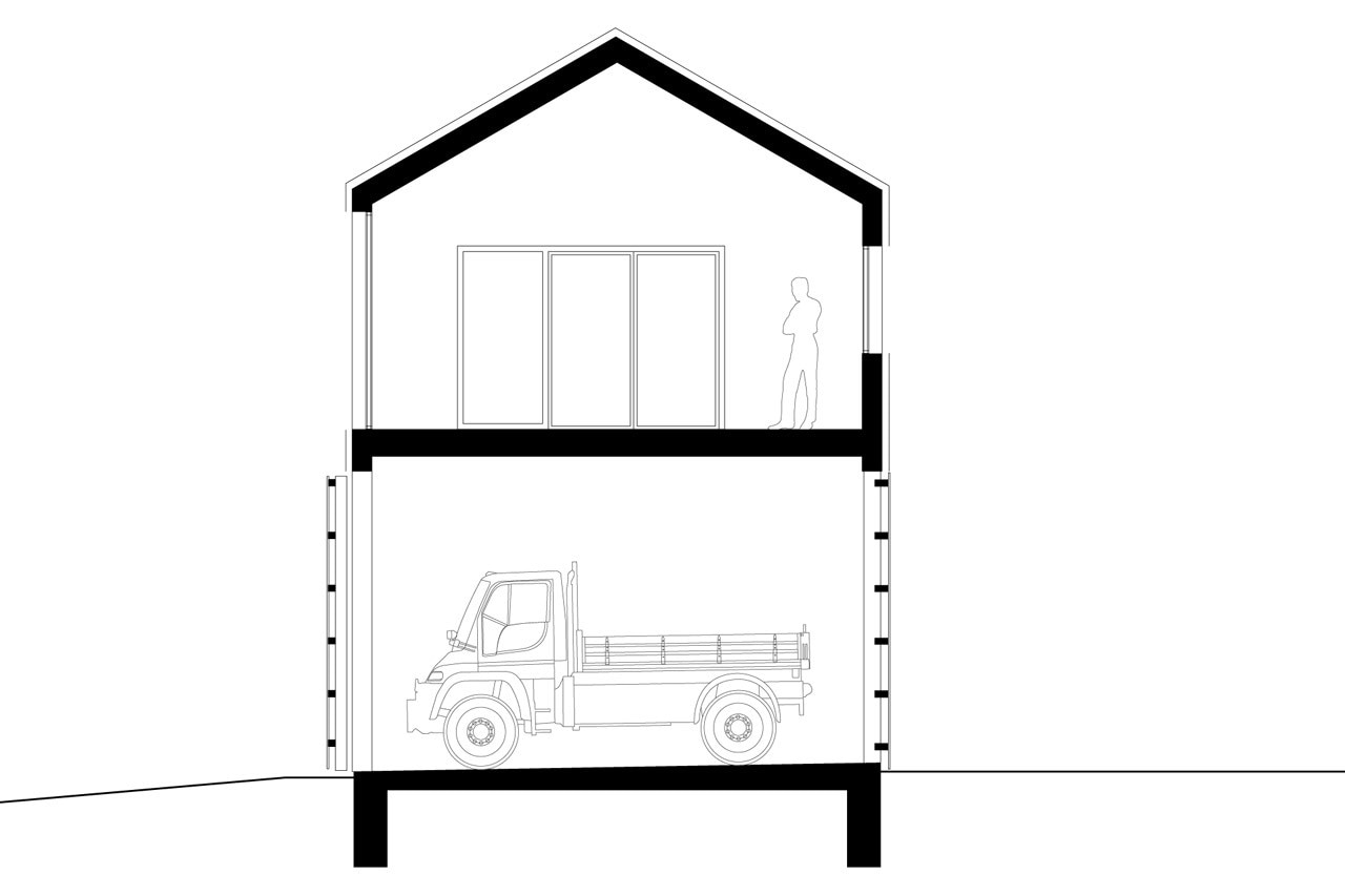 Il cambiamento d’uso si riflette nel prospetto: la parte inferiore, dedicata all’officina, è rivestita con pannelli di policarbonato traslucido. L’area di lavoro è così illuminata di luce naturale durante il giorno, mentre di notte si trasforma in una scatola luminosa che brilla nel quartiere.