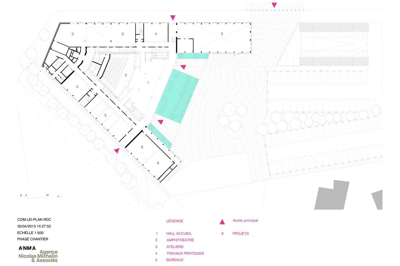 ANMA, Agence Nicolas Michelin et Associés, École supérieure d’ingénieurs de Bretagne Sud, Lorient, Francia. Pianta del piano terra