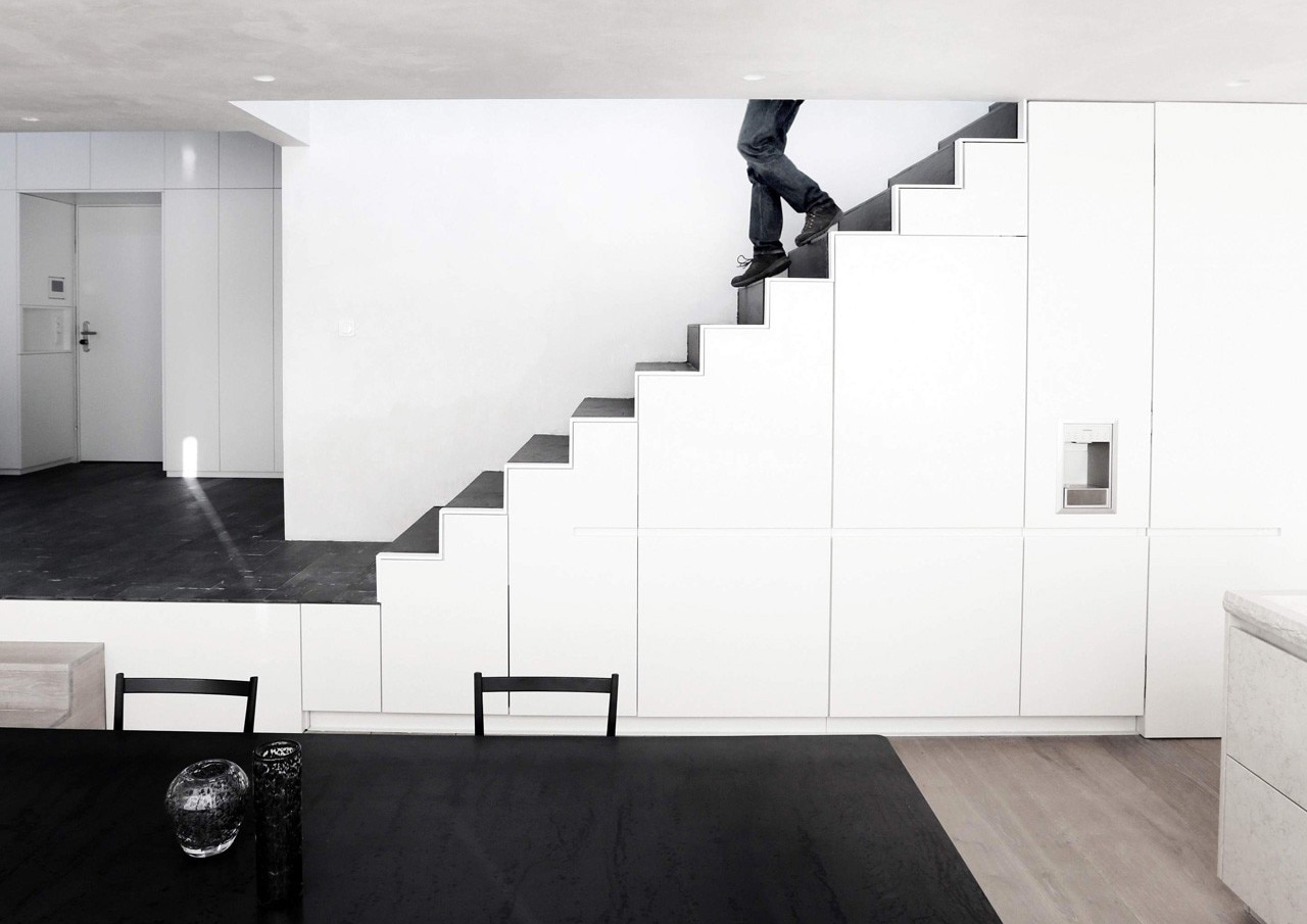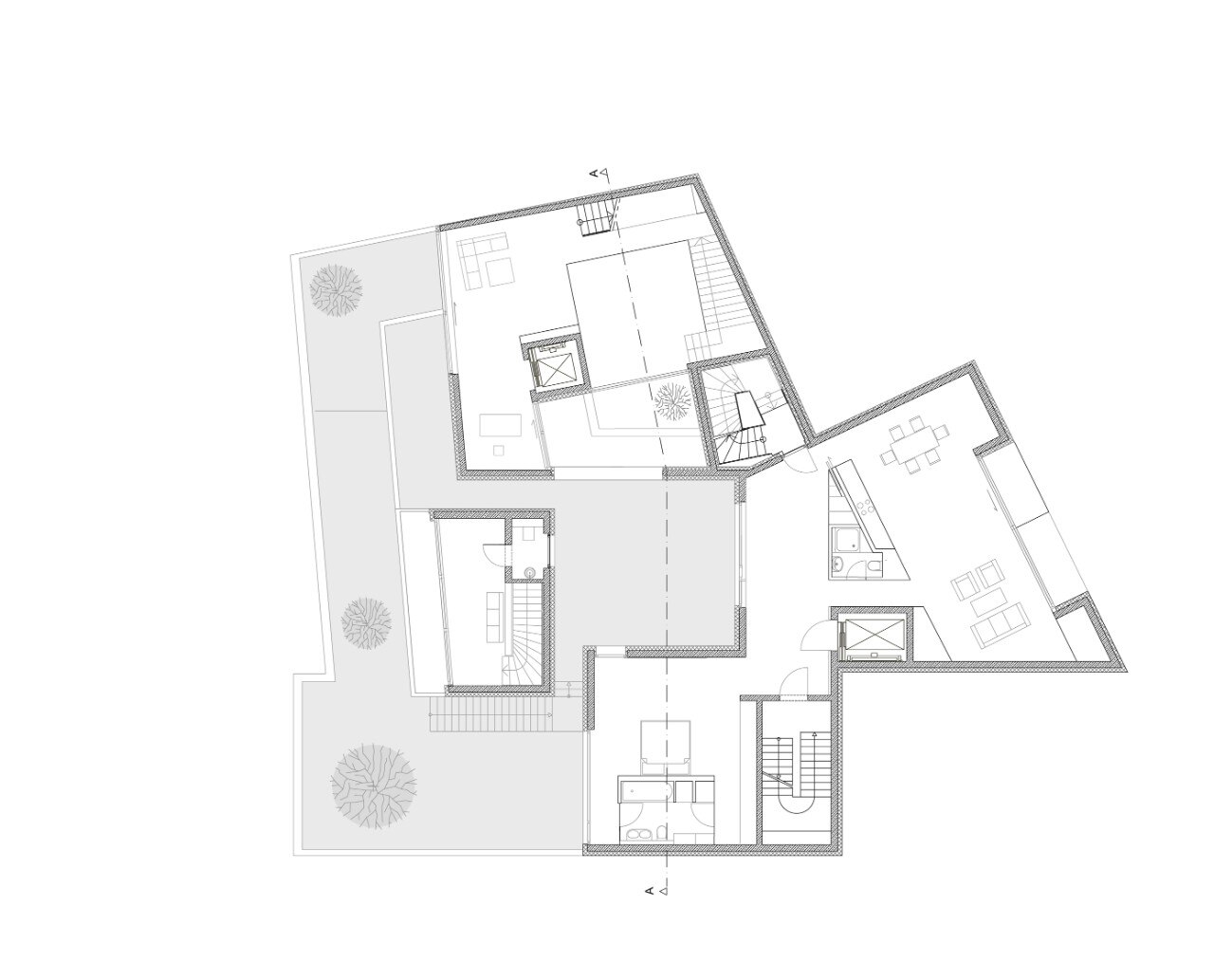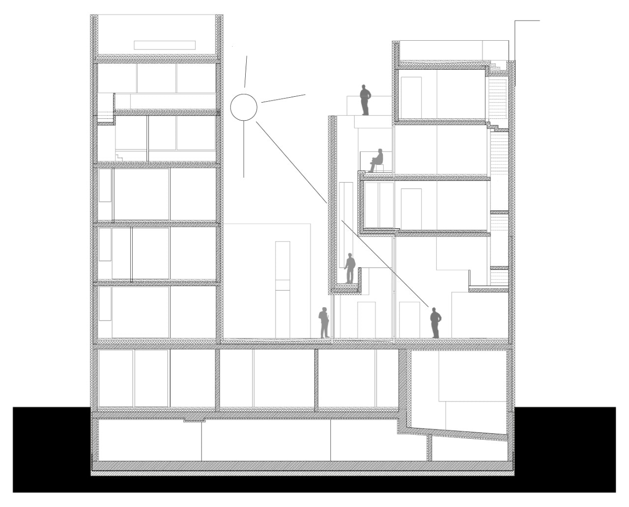 L'edificio anteriore a sei piani ospita un garage al piano interrato, al di sopra vi sono cinque appartamenti di cui due sono organizzati su due piani. Due villette a schiera, cinque e tre piani, intese come unità indipendenti verticali, accessibili tramite un cortile al primo piano. Tutti gli appartamenti sono stati progettati e personalizzati individualmente. Essi differiscono sostanzialmente tra loro ma formano un'unità.