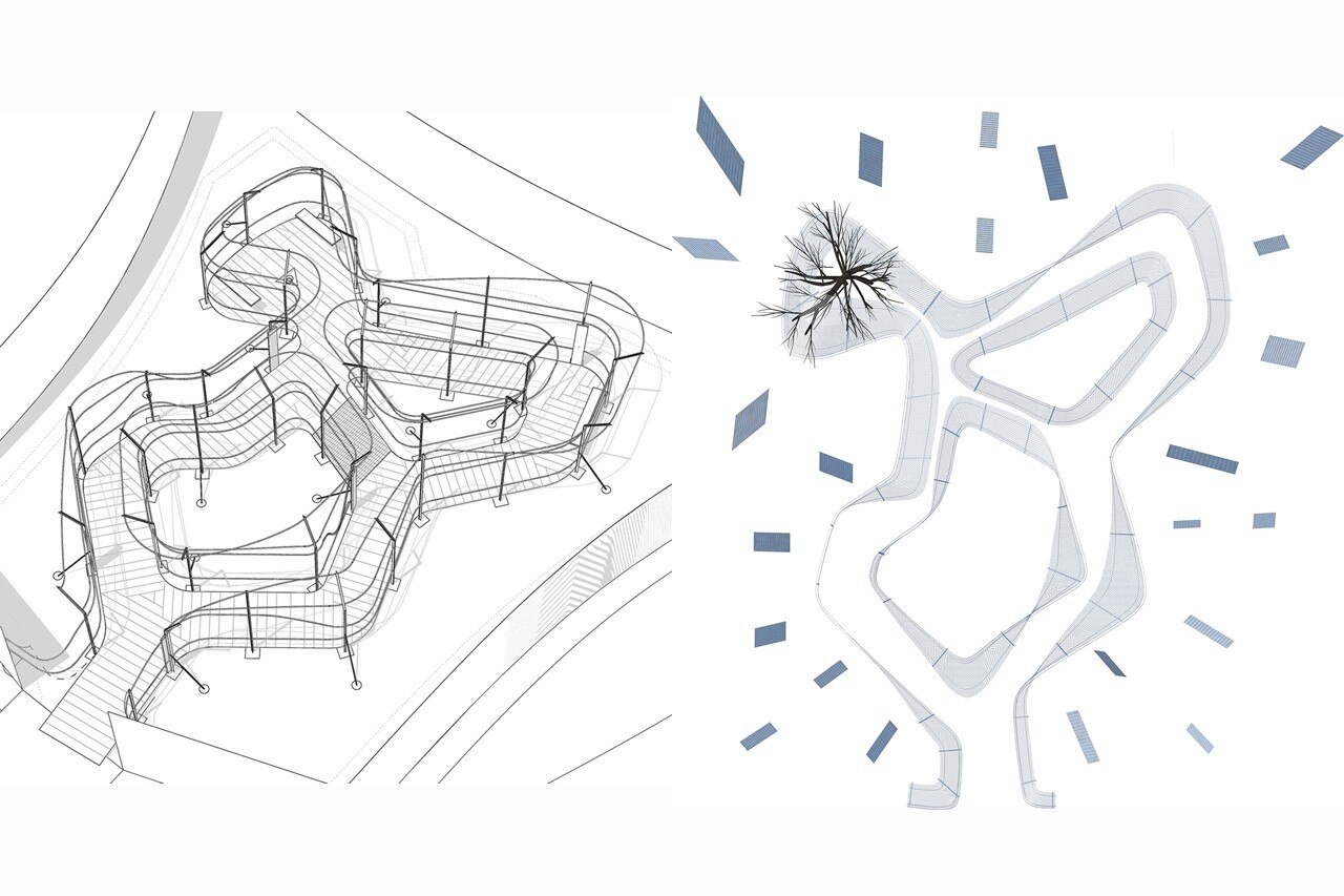 Il percorso è composto da elementi classici, rivisitati come se fossero distorti da un capriccio. Evocando il panorama urbano, la struttura si ossida, si rompe e si ondula. La geometria organica si presenta inizialmente aperta verso il cielo, per poi richiudersi sconvolgendo la percezione spaziale del visitatore.