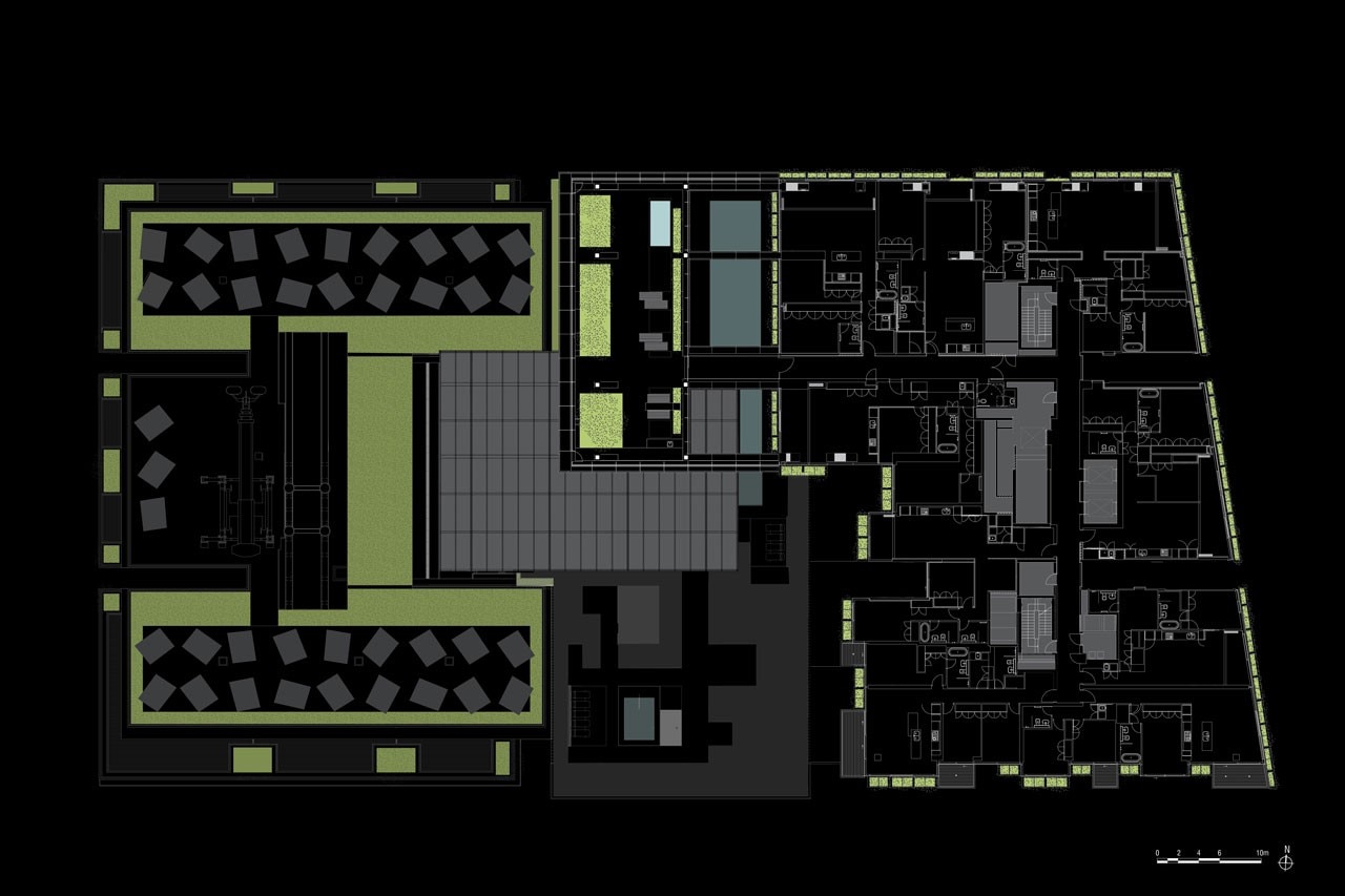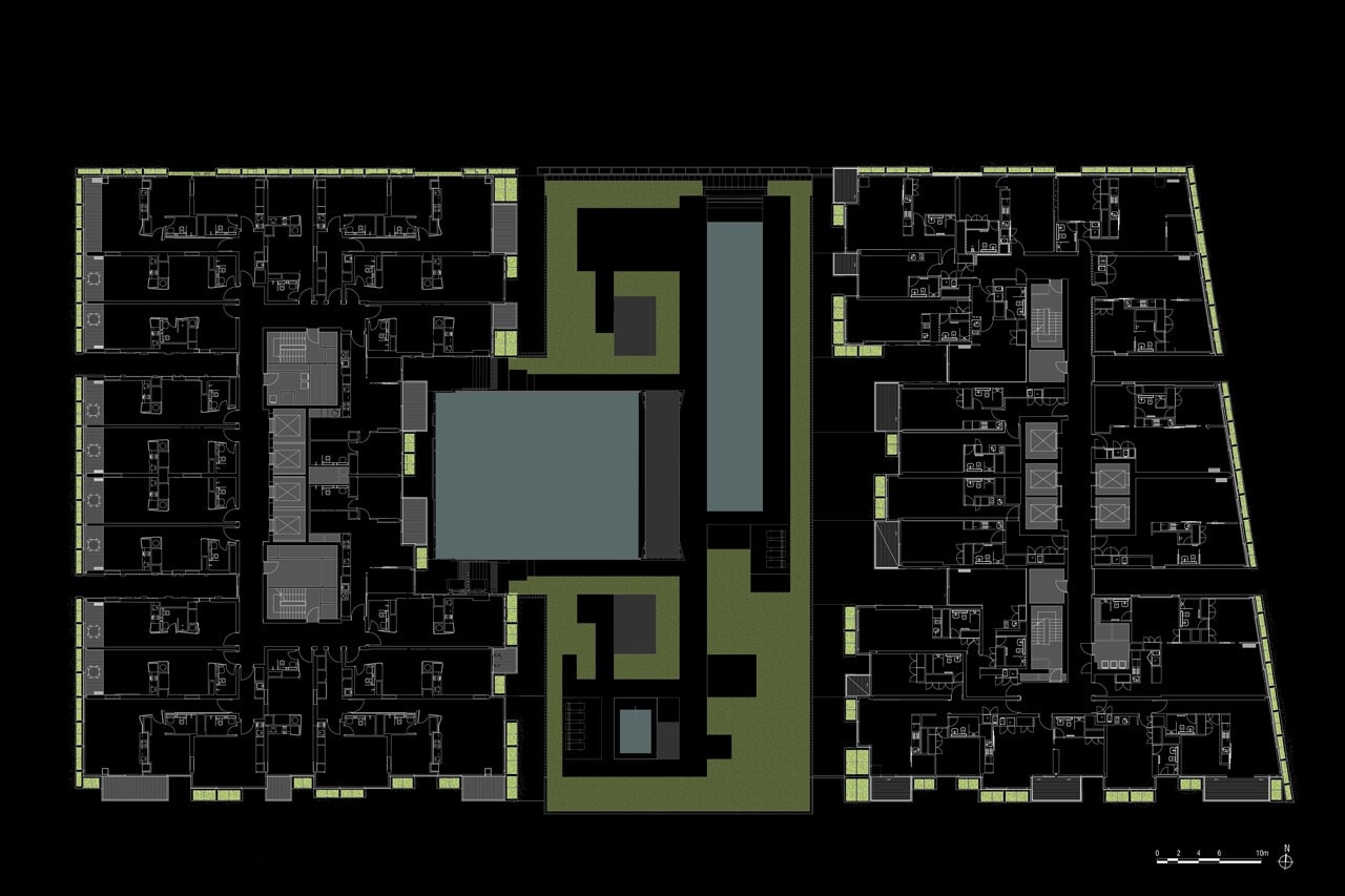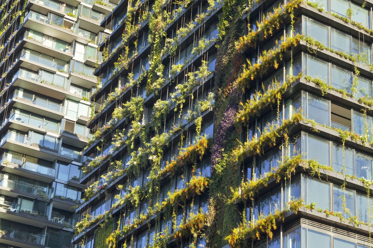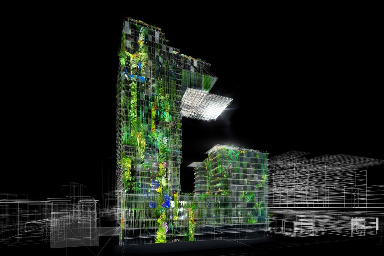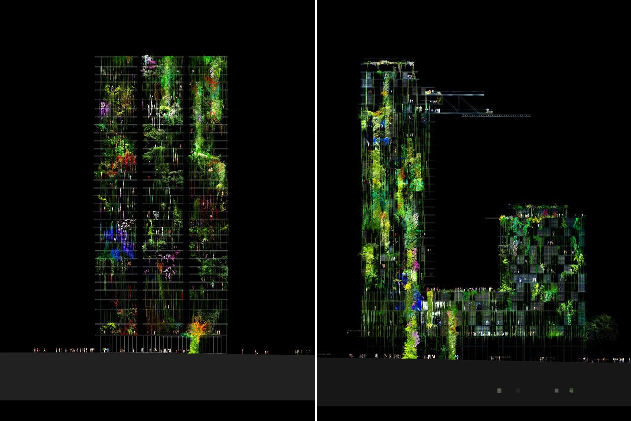 Alla scala individuale questo crea piacevoli giardini privati e, su scala collettiva, una scultura urbana verde. Sui lati nord, est e ovest, il verde assume le sembianze di un velo continuo con le pareti verdi, le fioriere continue e la vegetazione rampicante. Le piante mandano un messaggio di sostenibilità, la loro ombra riduce il consumo di energia per il raffrescamento e le foglie intrappolano l’anidride carbonica, rendendo l’edificio sostenibile.