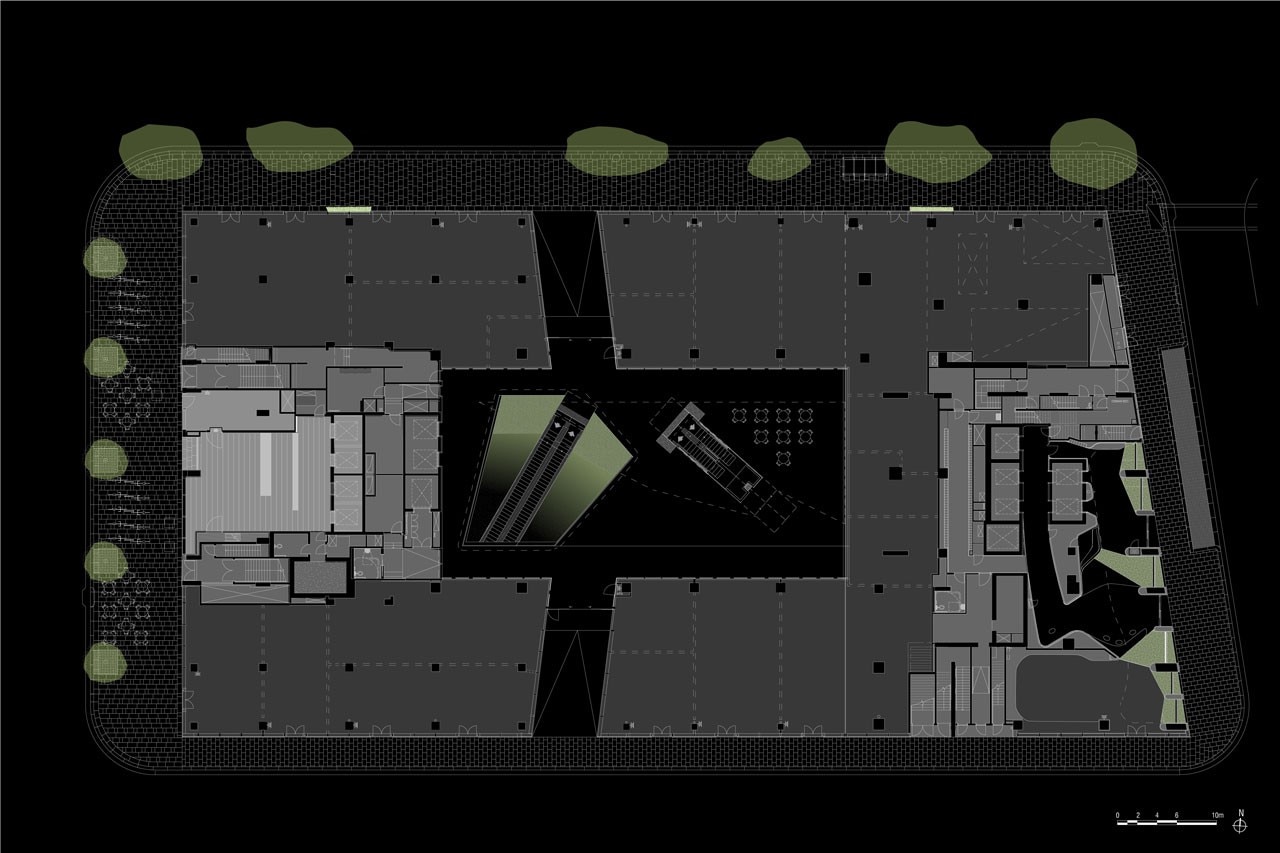 La seconda sfida progettuale è costituita dall’alta volumetria lungo il lato nord del sito. Per non ombreggiare eccesivamente il parco, il volume è suddiviso in due torri di diverse altezze. Sul tetto della torre più bassa, 42 eliostati (specchi che seguono la luce solare) reindirizzano la luce del sole a 320 riflettori posti su un aggetto che sporge dal volume più alto, i quali portano il fascio di luce verso il basso, illuminando aree che altrimenti sarebbero perennemente in ombra.