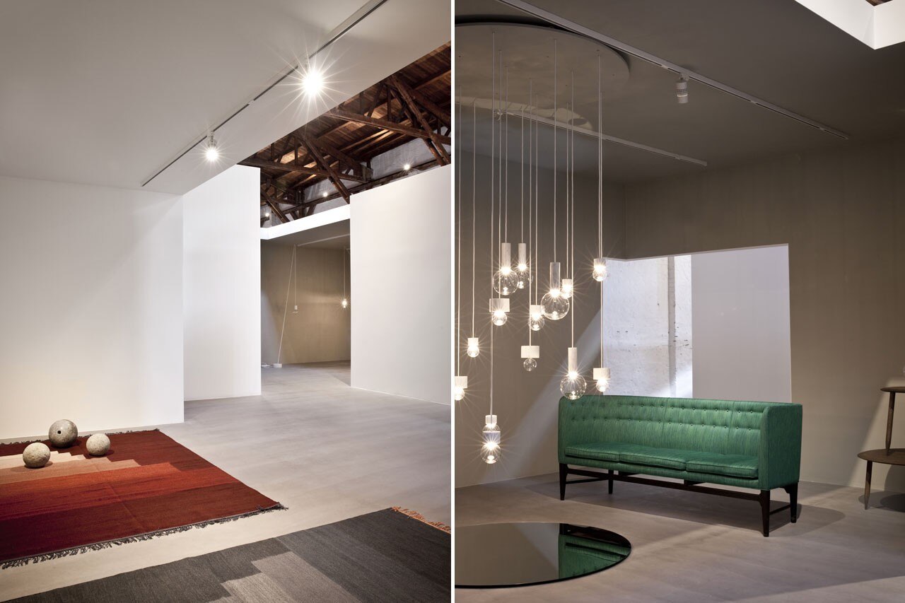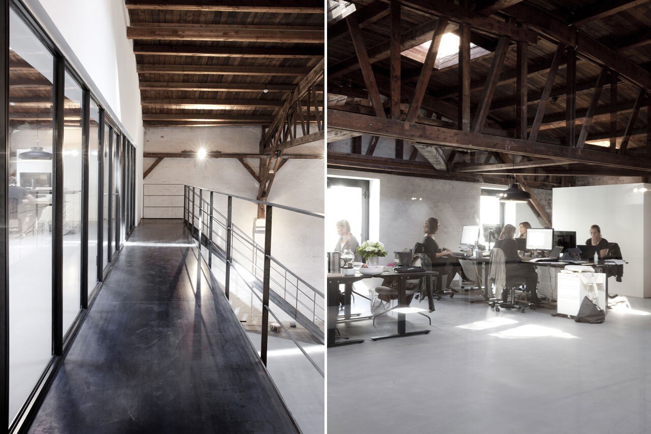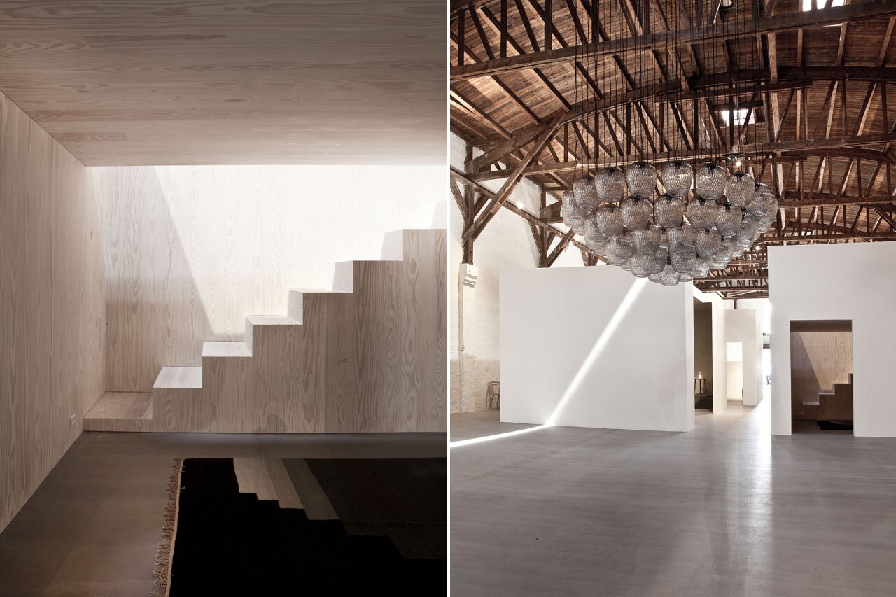 Ospitato in un grande magazzino di seicento metri quadrati, storicamente utilizzato come deposito di carta, lo spazio è stato spogliato e ridotto ai minimi termini. I timpani del tetto in legno sono mantenuti intatti e completamente visibili, mentre il pavimento è stato finito in cemento e resina, creando una superficie liscia e opaca.