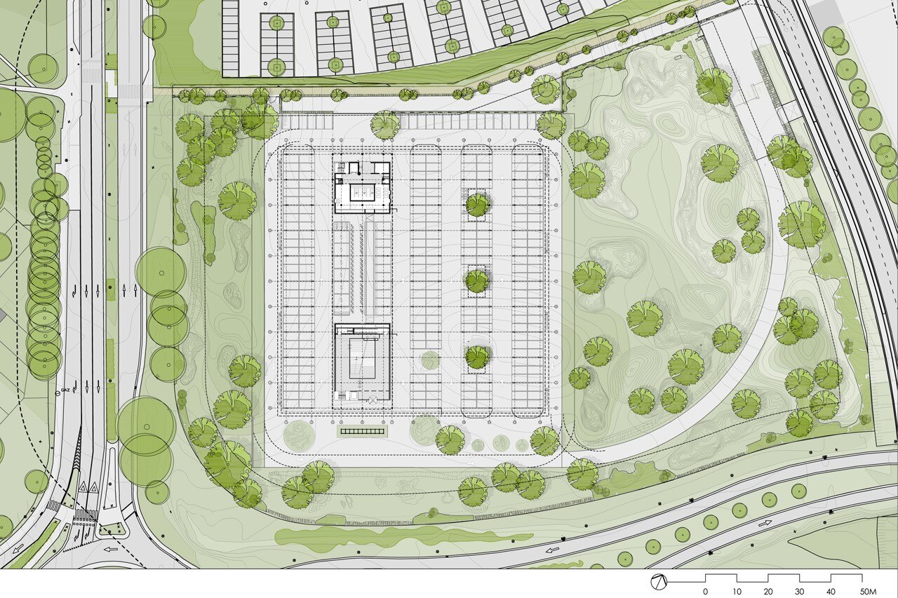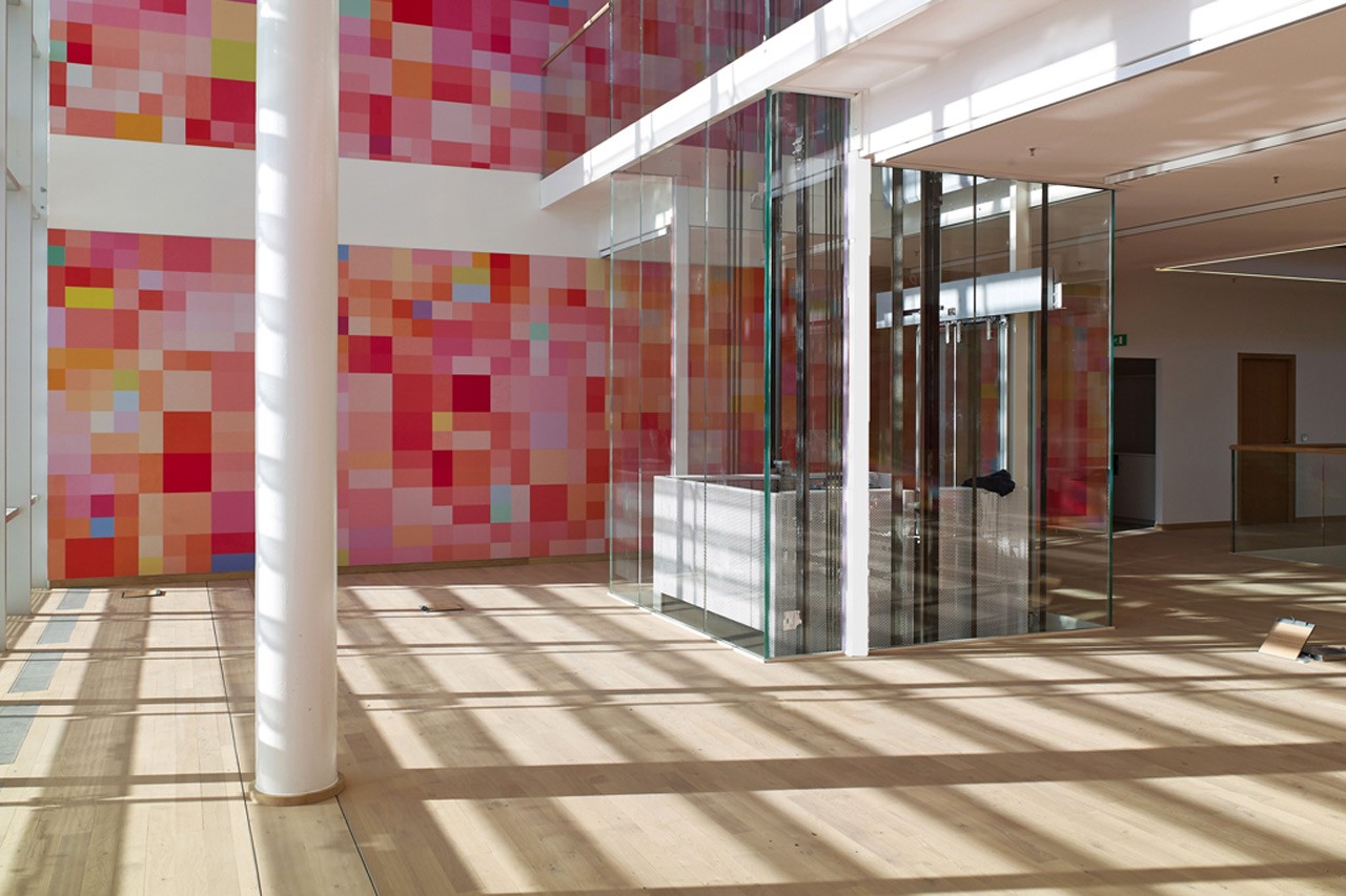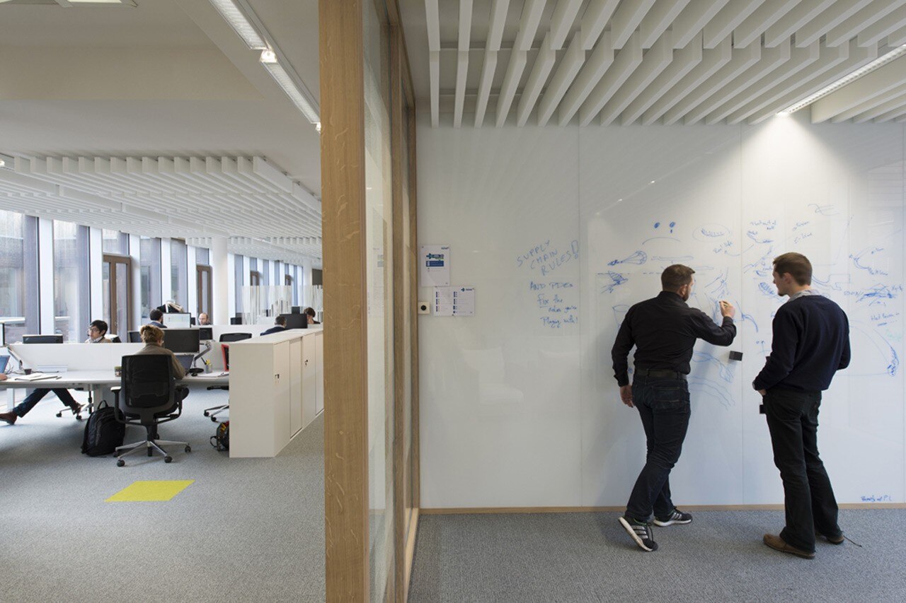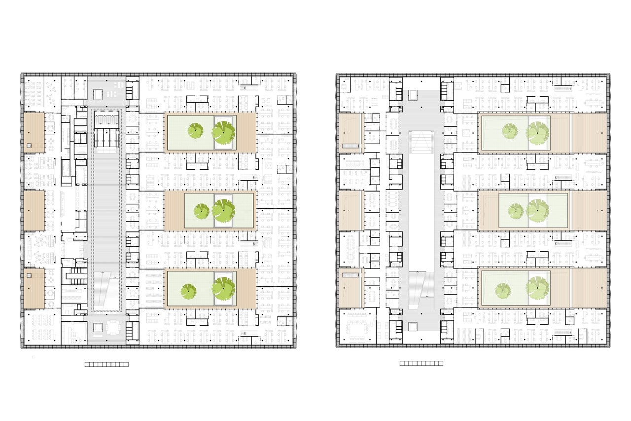Il layout interno degli uffici, distribuiti su una pianta quadrata con lati di 81 metri, è determinato dalla luce naturale e dalla qualità delle viste. La dualità tra compattezza (per le prestazioni energetiche) e layout (comfort visivo e benessere nei luoghi di lavoro) ha portato alla divisione del piano in quattro ali, disposte intorno a grandi cortili esterni.