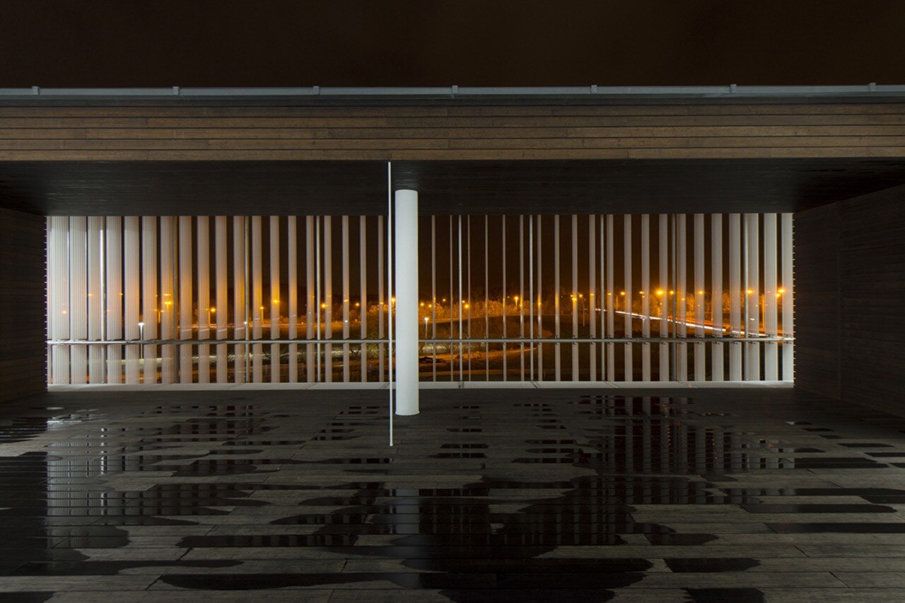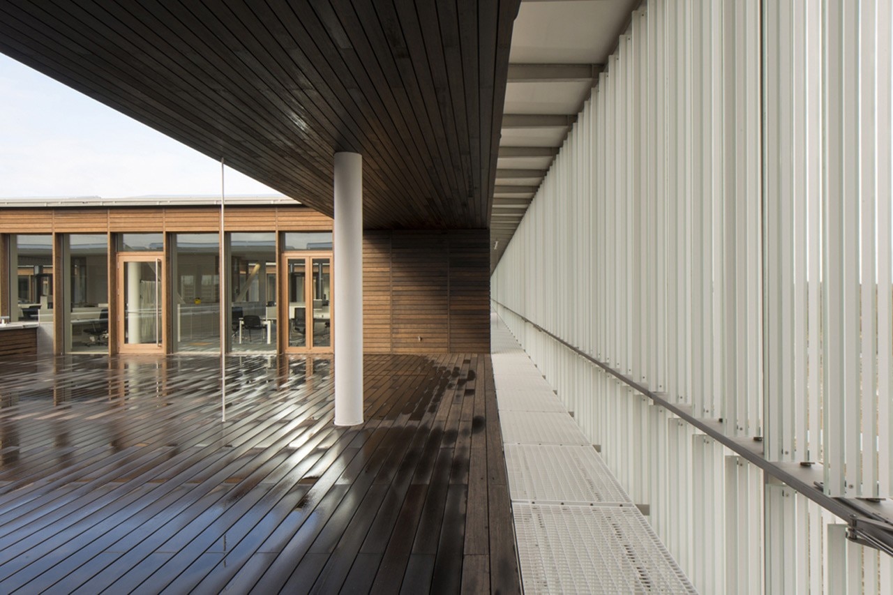 Le facciate vetrate dell’involucro esterno sono dotate di sistemi di ombreggiatura, anch’essi in vetro, che seguono il movimento del sole. Le superfici di questi schermi sono state trattate e stampate con fasce bianche alternate, consentendo il passaggio di luce naturale diffusa. Tutte le altre aperture sono dotate di persiane in legno di bambù.