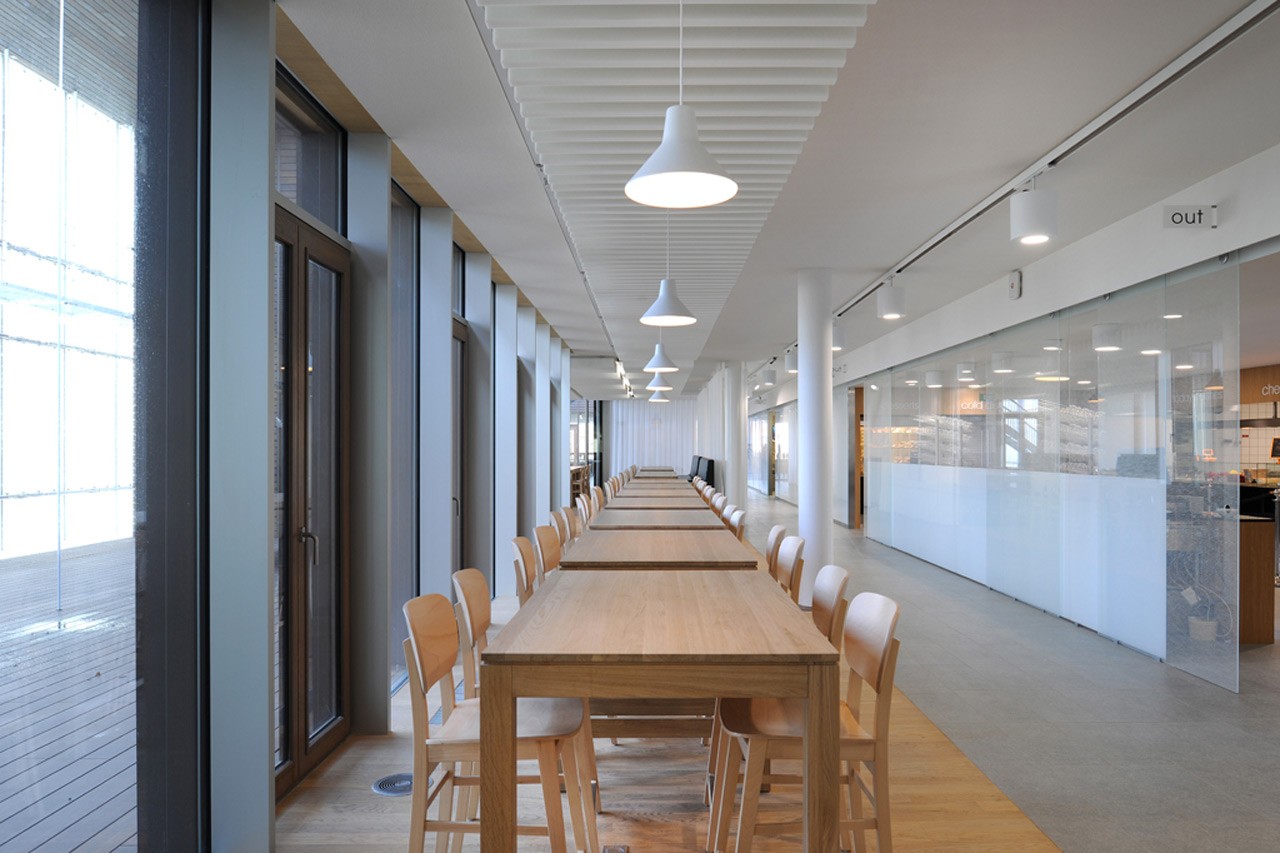 L’organizzazione dipartimentale di AGC Glass è flessibile e il progetto si adatta a questa struttura attraverso aree open space, uffici chiusi o ali separate, se necessario. La stessa flessibilità si applica alle sale conferenze e ai ristoranti, dove lo spazio è suddiviso utilizzando pareti acustiche mobili.