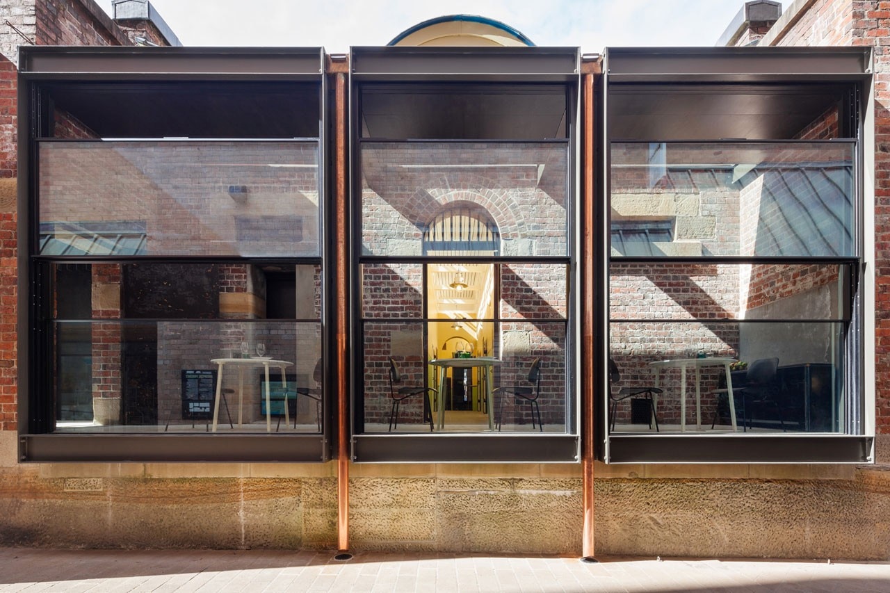 Una struttura in acciaio e vetro inserita tra le pareti di mattoni e arenaria esistenti crea un portico usato come zona pranzo conviviale, e trasforma il vicolo adiacente. Il nuovo ingresso su Nurses Walk, formato da sottili lame in acciaio, ospita i servizi e fornisce anche una soluzione di accesso alla costruzione. Questi elementi contemporanei hanno una qualità di materiali e dettagli che esalta e dialoga con il tessuto edilizio esistente. Acciaio, ottone e vetro sono materiali noti per essere sia robusti che raffinati, e riflettono le qualità del patrimonio edilizio, mentre lo aprono a nuove possibilità.