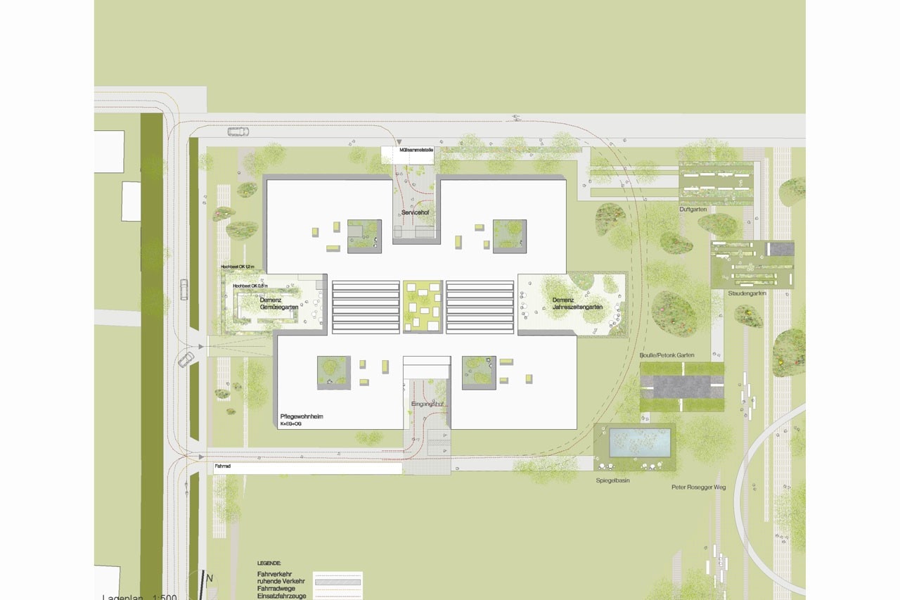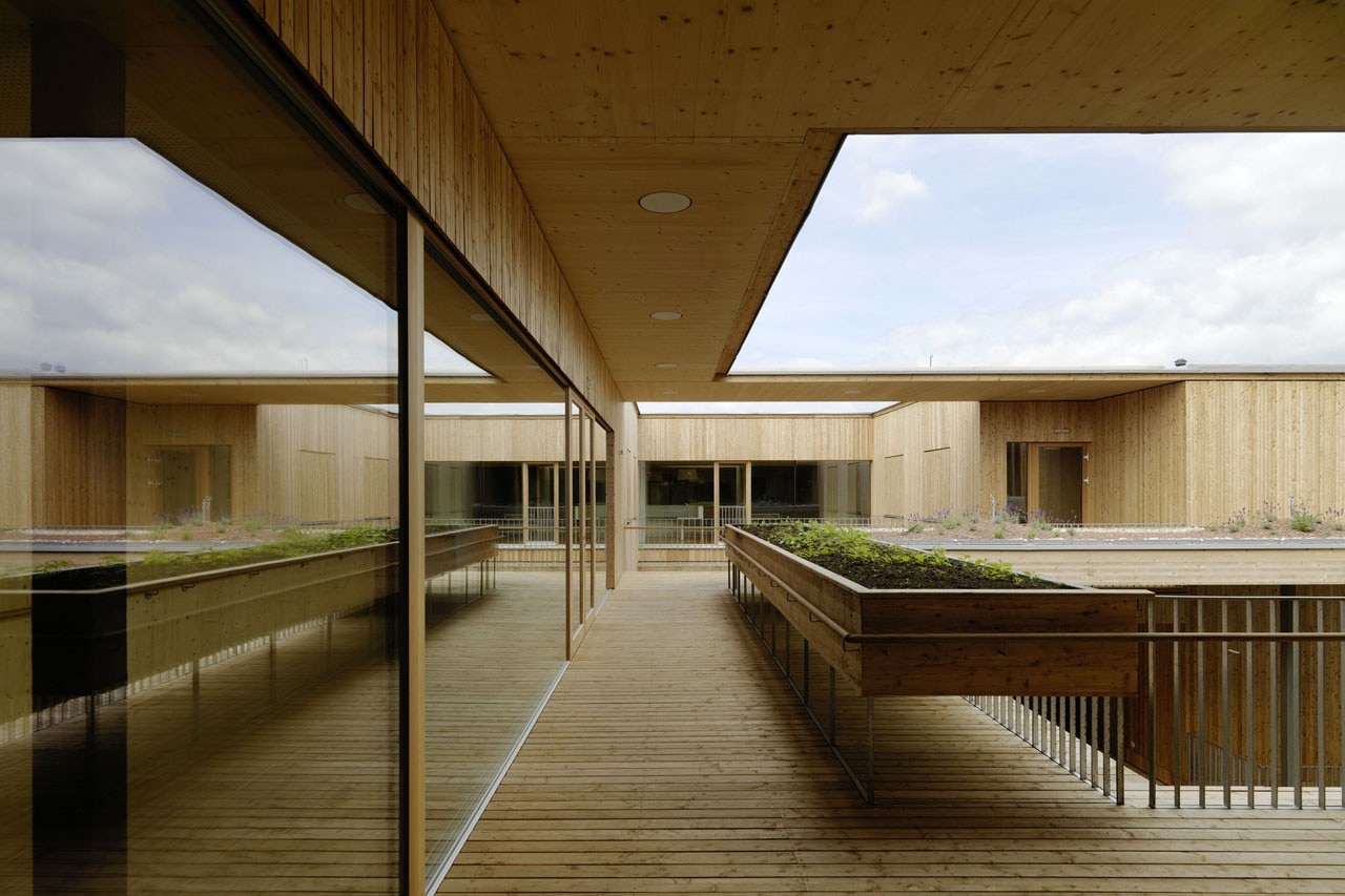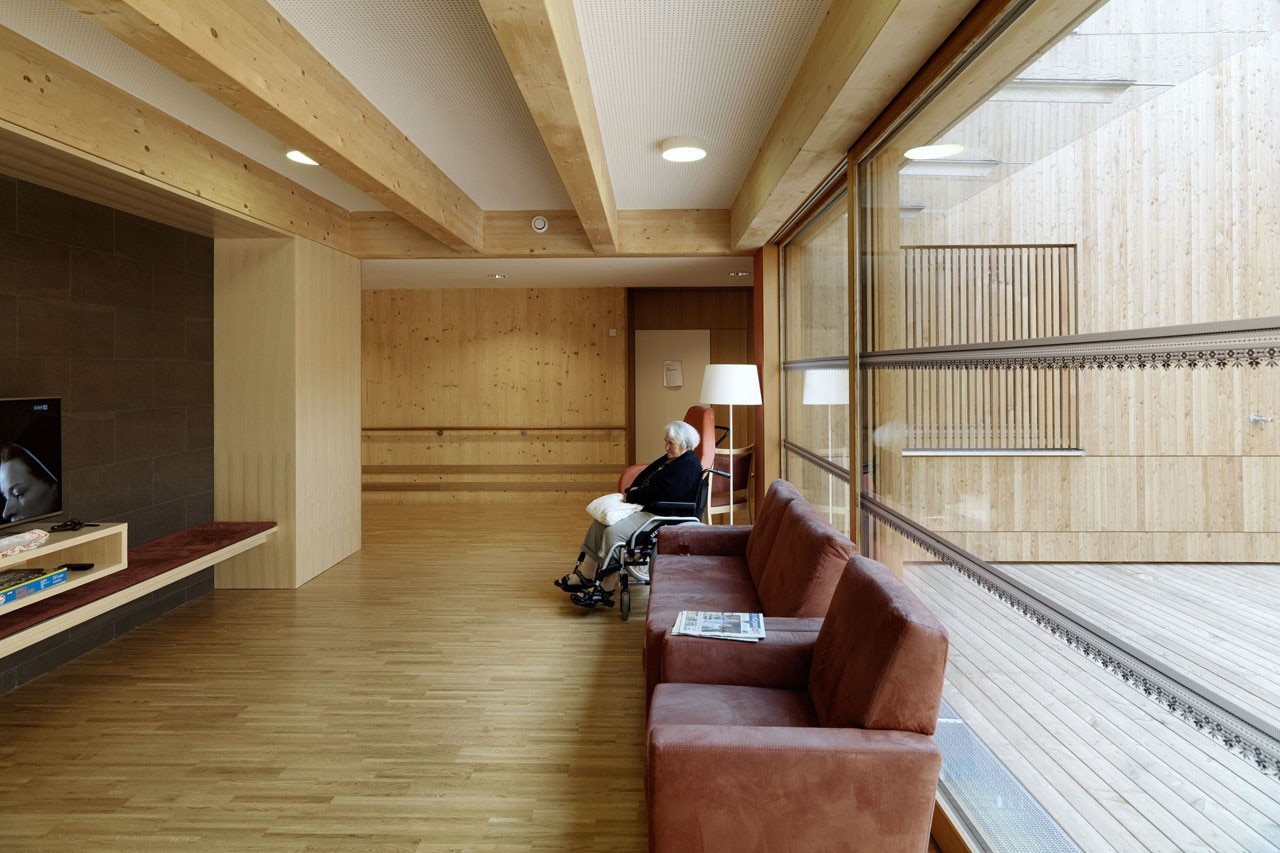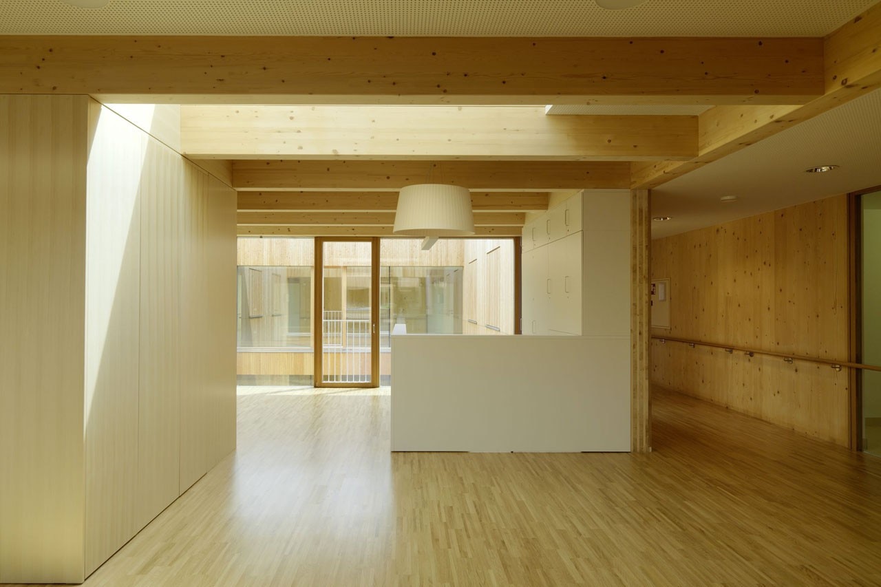 Grazie a un concetto di sicurezza antincendio meticolosamente pianificato con adeguate misure compensative, la casa di cura ha potuto essere costruita come una casa passiva in legno prefabbricata, con un seminterrato. Una struttura in legno con traversi in lamellare e travi in legno è stata utilizzata per soddisfare le esigenze statiche e strutturali dell’edificio.