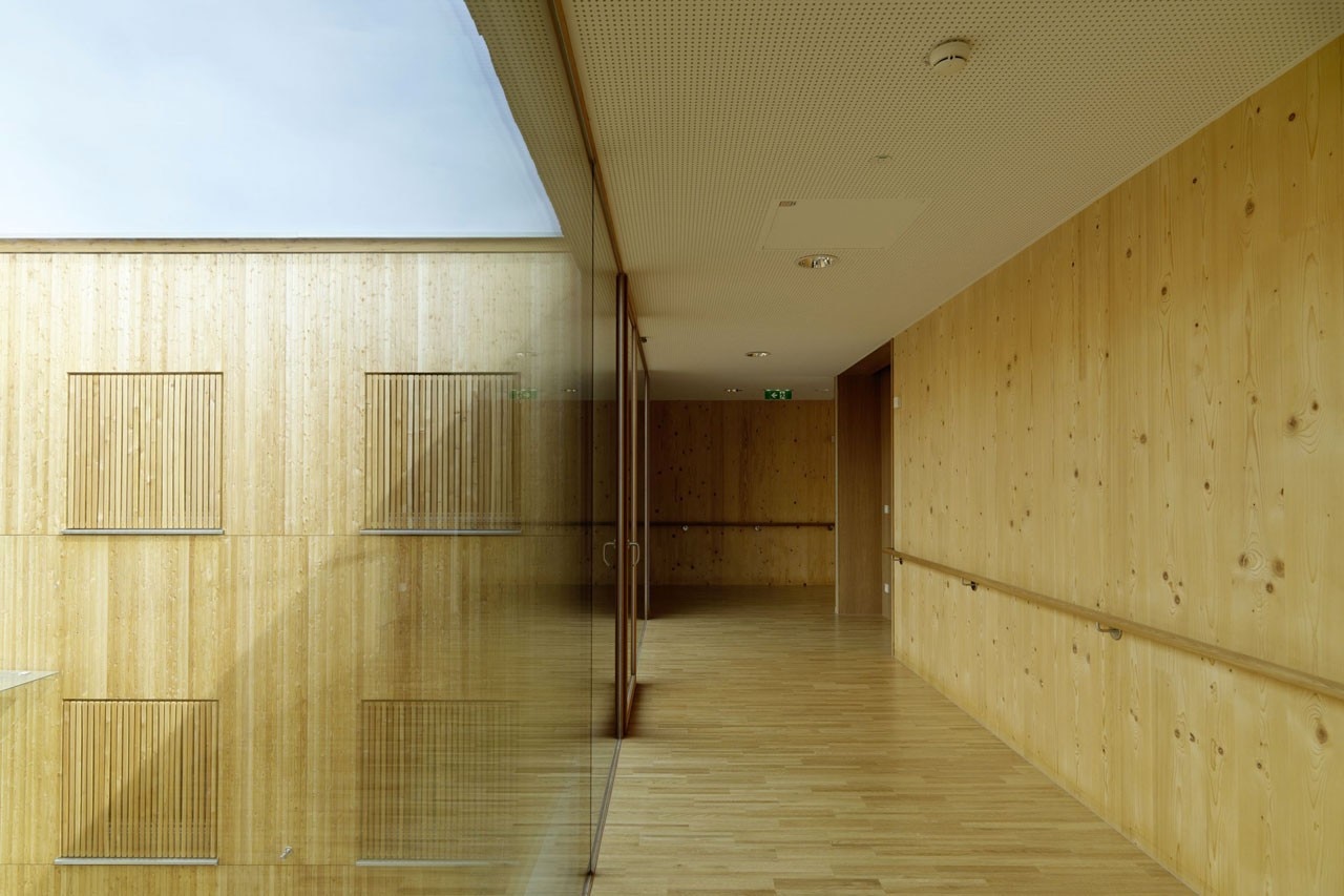 Al fine di ottenere un’atmosfera accogliente e spaziosa, le travi in legno sono state utilizzate per i soffitti delle sale comuni. Le pareti esterne sono costituite da un telaio di legno isolato con lana di roccia e pannelli di legno esterni. Unica eccezione il piano interrato, costruito in cemento armato.