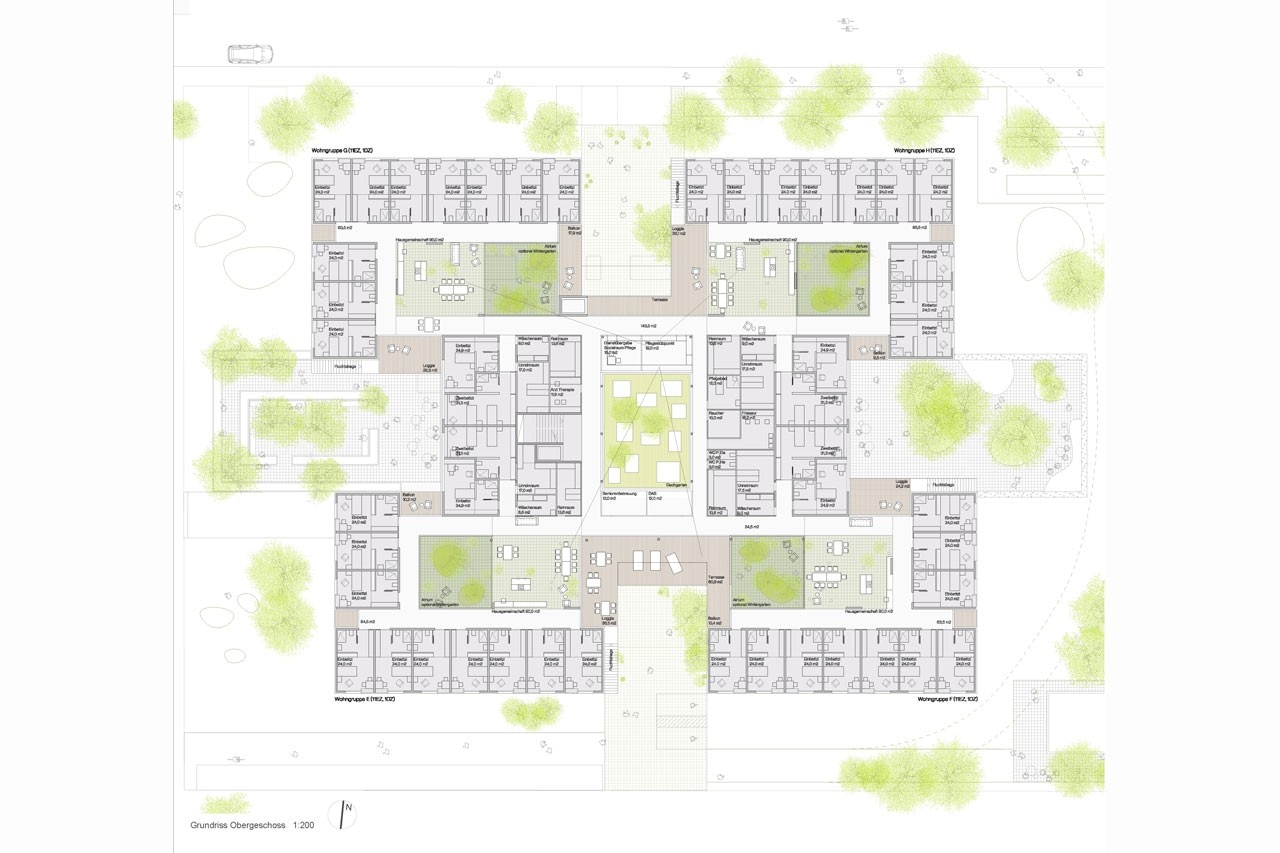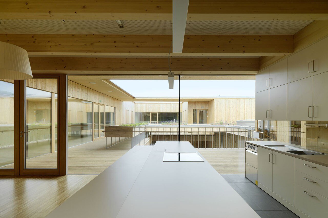 Ogni unità è composta da camere, una cucina e una zona pranzo per 13 residenti e un accompagnatore, con il risultato di un ambiente gestibile e familiare. Grandi balconi e logge, e una varietà di percorsi e viste attraverso altre parti della casa creano un ambiente stimolante.