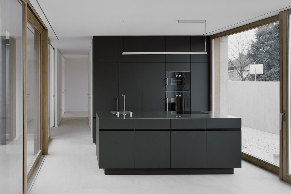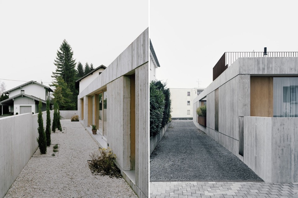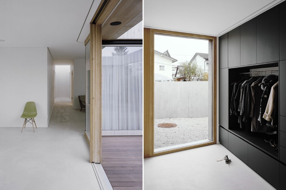 Dall’esterno la casa sembra ermeticamente chiusa, ma al suo interno si apre e sviluppa una sequenza di spazi interni ed esterni. Il centro della casa è un atrio affacciato verso sud. Le grandi finestre scorrevoli permettono a questo spazio di far parte sia del soggiorno sia della zona pranzo. Lo stretto cortile a forma di L collega esternamente le altre aree di vita e, insieme a una terrazza sul tetto di dimensioni generose, offre ulteriori spazi esterni che, a seconda del momento della giornata, creano una varietà di rapporti visivi.