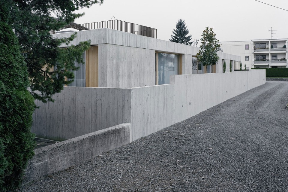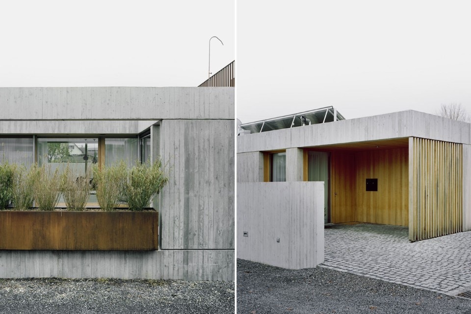 I materiali scelti rafforzano l’impatto di questa residenza come un volume a sé stante. Il cemento armato come elemento strutturale e progettuale plasma il modo in cui l’edificio viene percepito. I telai delle finestre, come gli schermi di stecche verticali posti davanti ad alcune di esse, sono in rovere trattato.