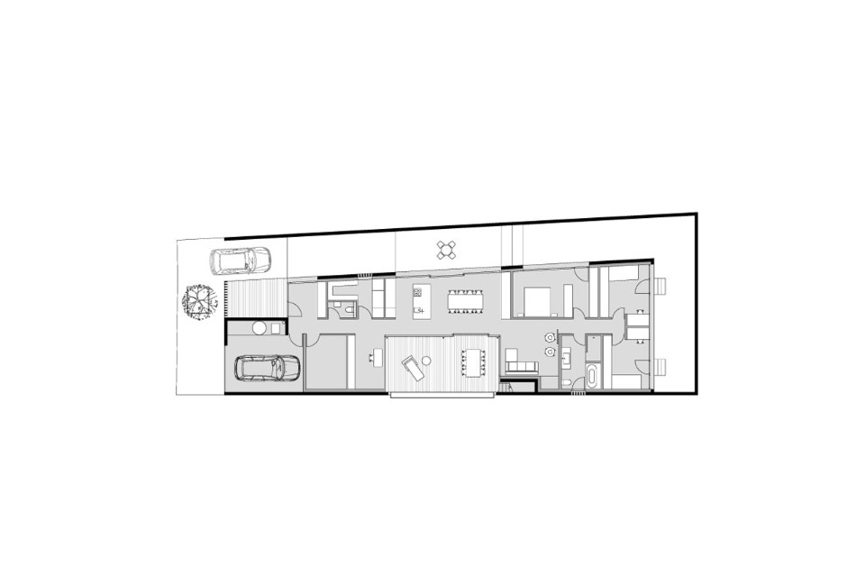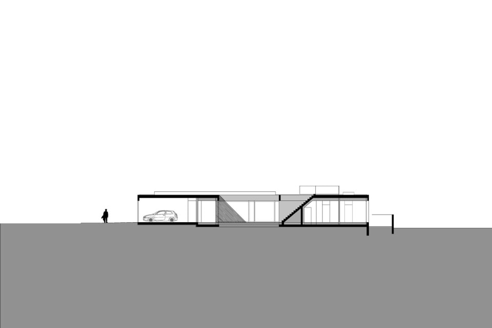 La risposta a queste particolari condizioni è stato un volume di solo piano chiuso su tutti i lati da un muro. La casa occupa la più vasta area possibile su cui era permesso di costruire e le dimensioni del terreno sono rivelate da un muro che corre lungo il perimetro e protegge la privacy dai vicini, distanti solo tre metri.