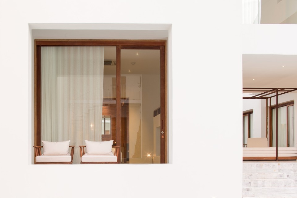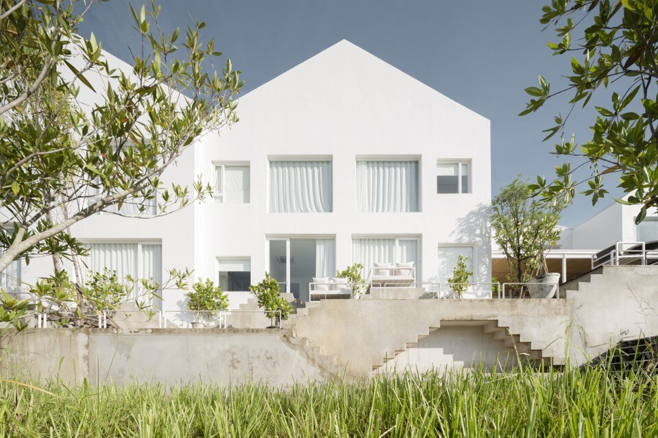 La vista panoramica del fiume Chao Phraya e sul tempio di Putthai Sawan non può essere colta dal cortile, circondato dai muri di mattoni, ma solo raggiungendo il ristorante e procedendo verso il ponte sul fiume. In questa posizione, si vede un’altra facciata dell’hotel, con volumi a timpano dalle pareti bianche, gradoni e terrazze sul fiume.
