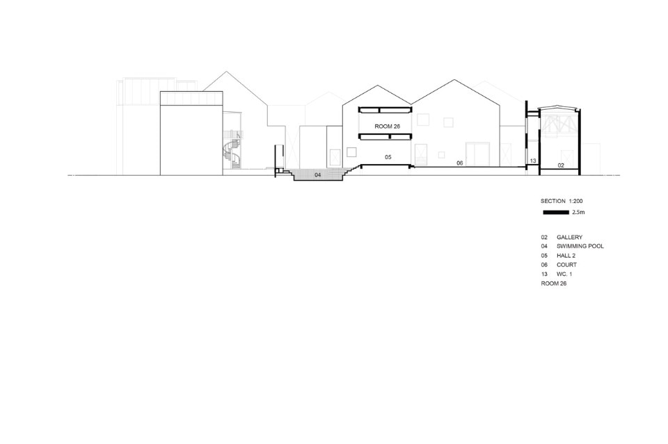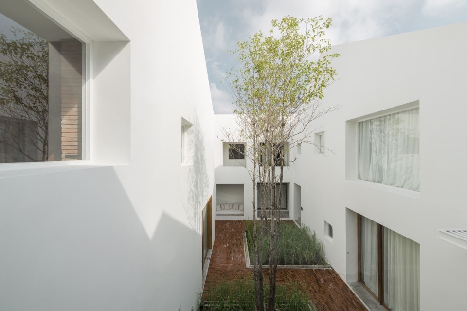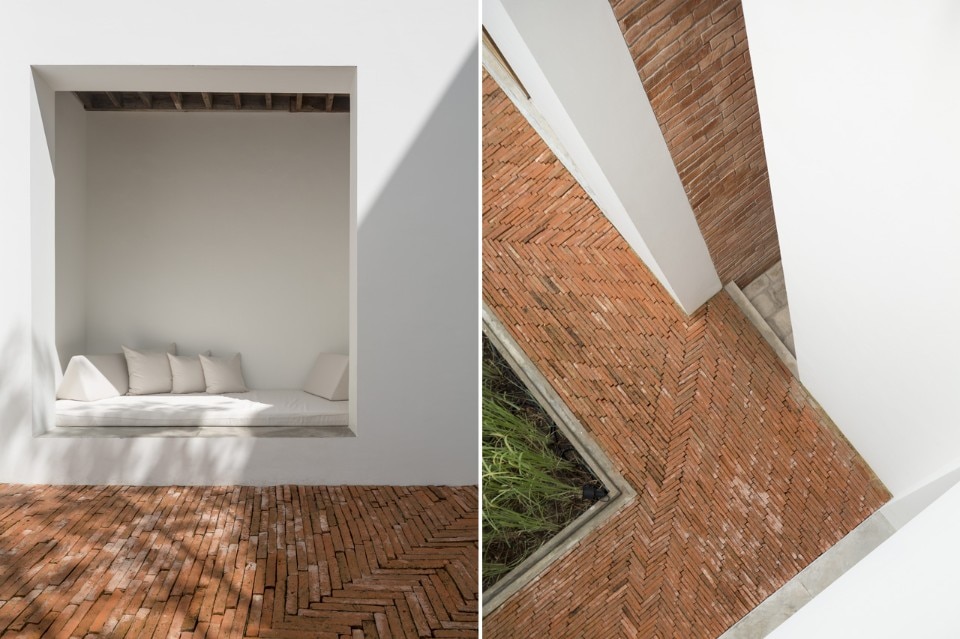 Il layout comprende dodici residenze private disposte all’interno del lotto a forma di L, lasciando gli spazi esterni nei punti focali. In questi spazi si fa uso dei laterizi prodotti artigianalmente in loco, giustapposti alla semplicità delle pareti bianche, e di una soluzione al problema delle inondazioni annuali ispirata ai gradoni del pozzo Chand Baori in Rajasthan, India.