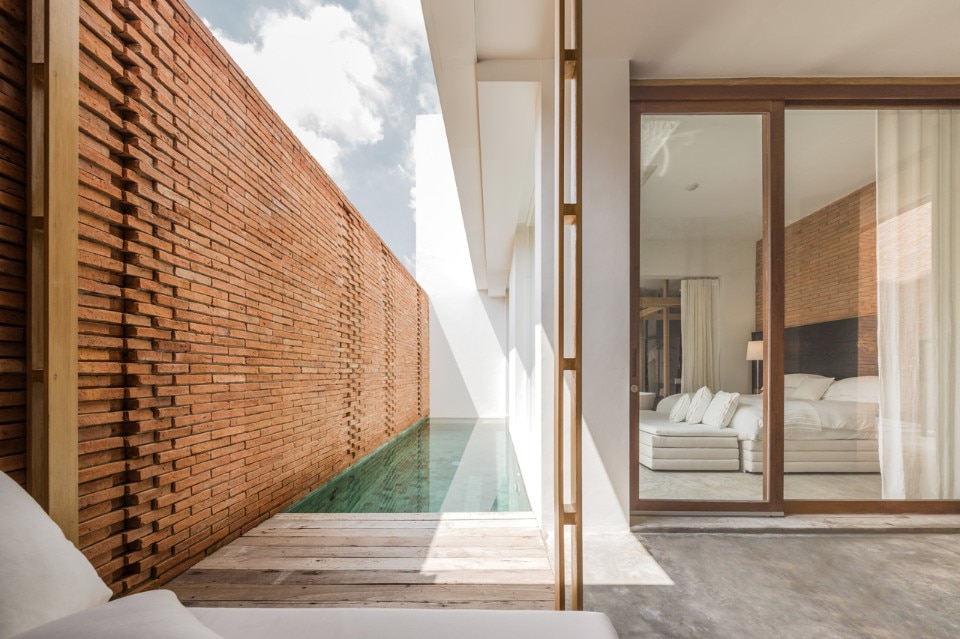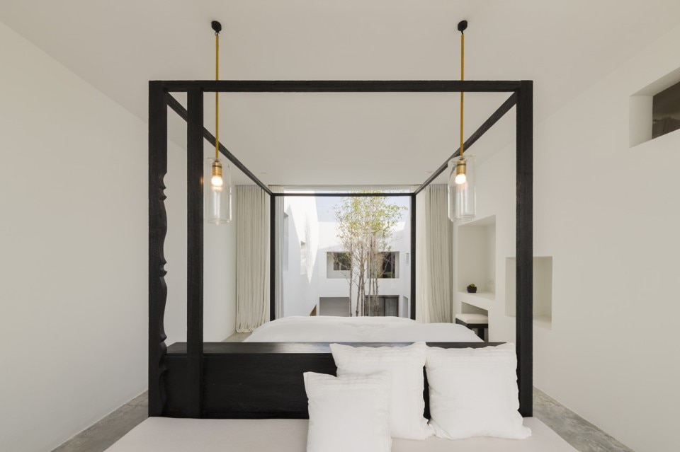 La forma delle lampade di granito caratterizza la sala del ristorante. Realizzate da un’impresa locale, sono installate secondo un sistema a griglia che appare tuttavia dinamico grazie alle posizioni precise dei pesi che cambiano il pattern di cavi elettrici, da lineare a zig-zag. L’immagine di una tigre che salta in avanti, cioè la forza secondo la tradizione tailandese, è incisa sulla testata dei letti in legno, mentre la sezione di un tipico ornamento chiamato luk-mahuad è riprodotta sui ripiati dei bagni e sui letti.