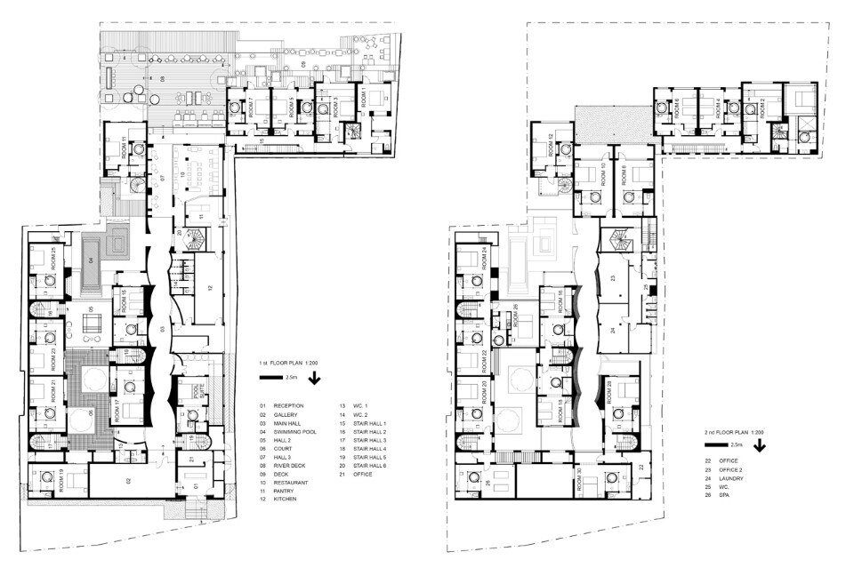 Il pattern dei gradini, destinati a essere allagati, può essere spiegato come un elemento preso a prestito dall’architettura di Ayutthaya. Gli architetti hanno riprodotto in dimensione ridotta un angolo del Phutthai Sawan, scalato e ridisegnato per adattarsi alle pareti interne ed esterne, ai piani orizzontali e verticali, ai mobili e ai tessuti.