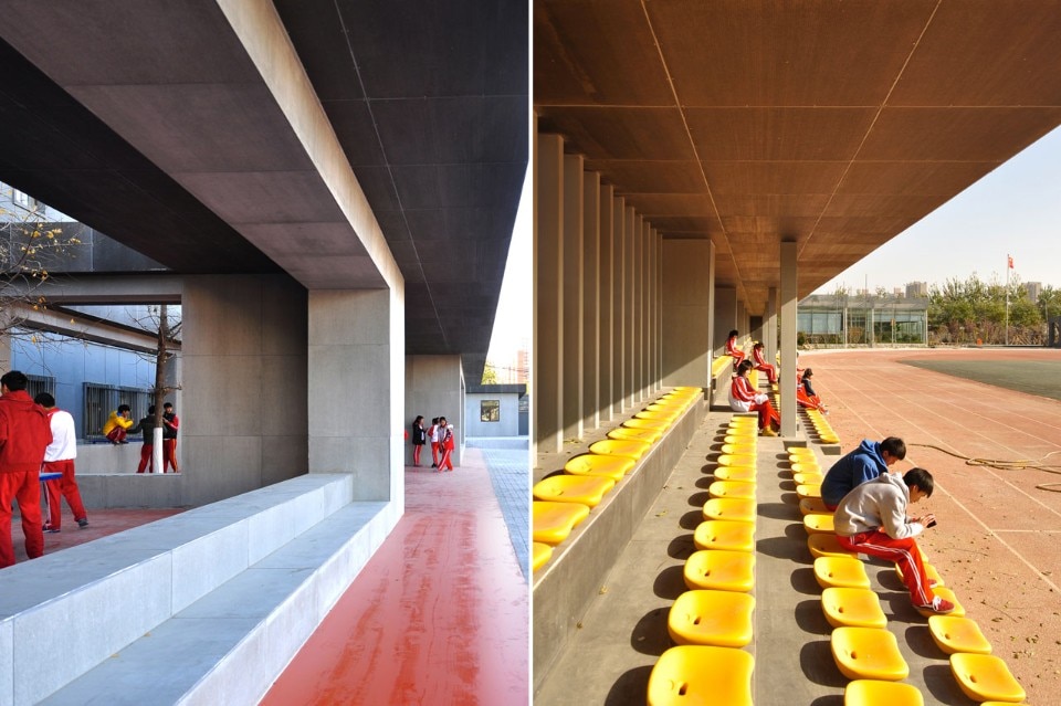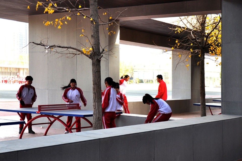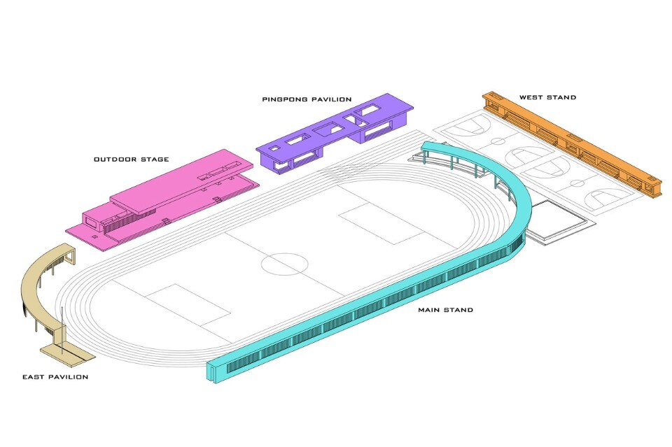 Il campo sportivo è unificato da un un unico linguaggio formale e materiale. Gli alberi esistenti non sono più barriere ma zone cuscinetto che collegano i diversi programmi. La pista all’aperto con un grande tetto a sbalzo e il padiglione per il ping-pong sul lato nord del campo sportivo eliminano l’emozione negativa indotta dall’ombra. La continuità orizzontale creata dalla sua scala rendono la tribuna e l’area ping pong più articolate. Il padiglione offre più spazio per il ping-pong e agisce come una barriera al vento.